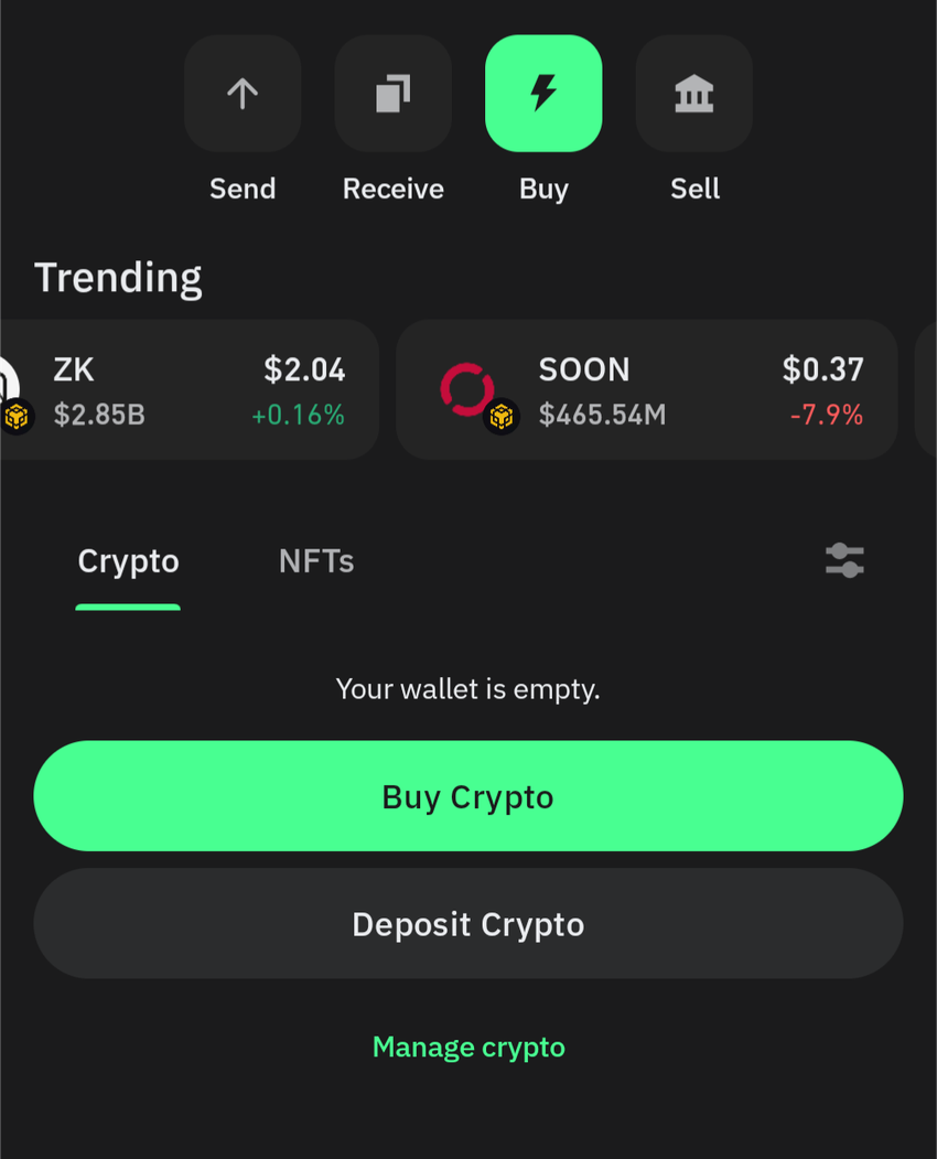 Kapag na-set up mo na ang iyong passcode, makakarating ka sa isang welcome screen na may mga pagpipilian upang bumili o magdeposito ng crypto.