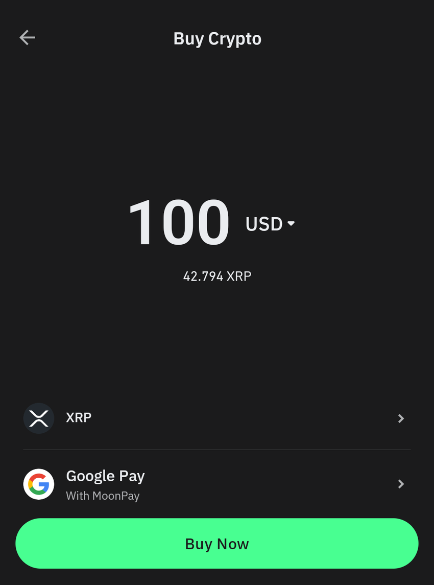 Ang pamamaraang ito ay gumagamit ng mga serbisyo sa pagbabayad ng third-party na binuo sa app, kaya maaari kang bumili ng XRP gamit ang dolyar, euro, o iba pang mga pera. Ito ay maginhawa para sa mga bagong dating dahil parang katulad ito ng isang regular na online na pagbili.