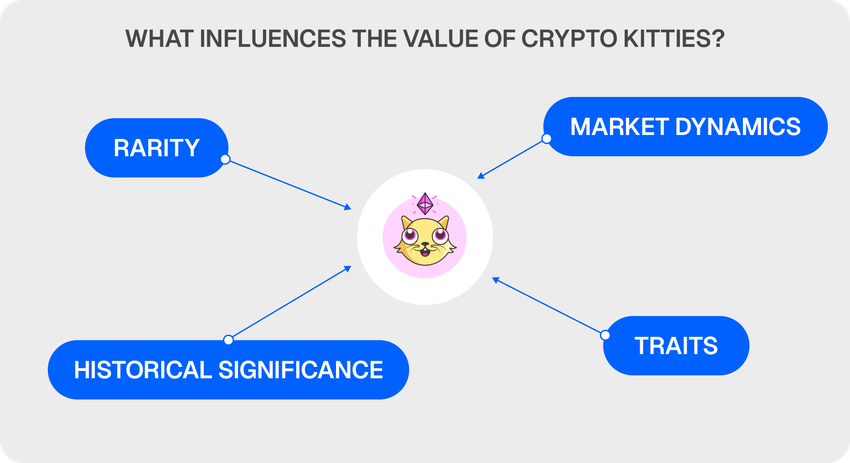 Ang CryptoKitties ay nagtataglay ng halaga lalo na dahil sa kanilang bihirang, mga katangian, at makasaysayang kahalagahan sa puwang ng paglalaro ng blockchain. Maraming mga kadahilanan ang nakakaimpluwensya sa halaga ng merkado ng mga NFT na ito, na may pakikipag-ugnayan sa pagitan ng mga henerasyon, katangian, at panlabas na kondisyon ng merkado na nagtutulak sa mga pagbabago ng presyo.