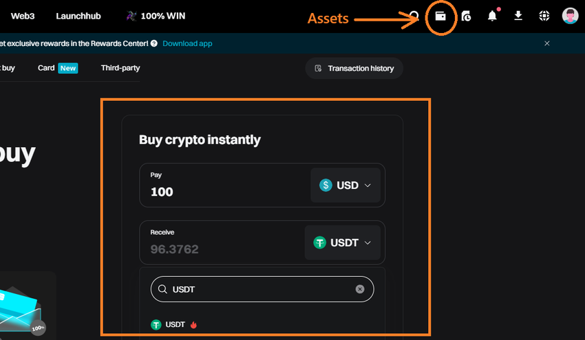 Dahil hindi mo mabibili ang ETC gamit ang fiat direkta, kailangan mong i-convert ang fiat mo sa USDT o ibang listed base currency muna. Sa Bitget, pumunta sa “Assets” > “Buy Crypto” at sundan ang mga instructions.