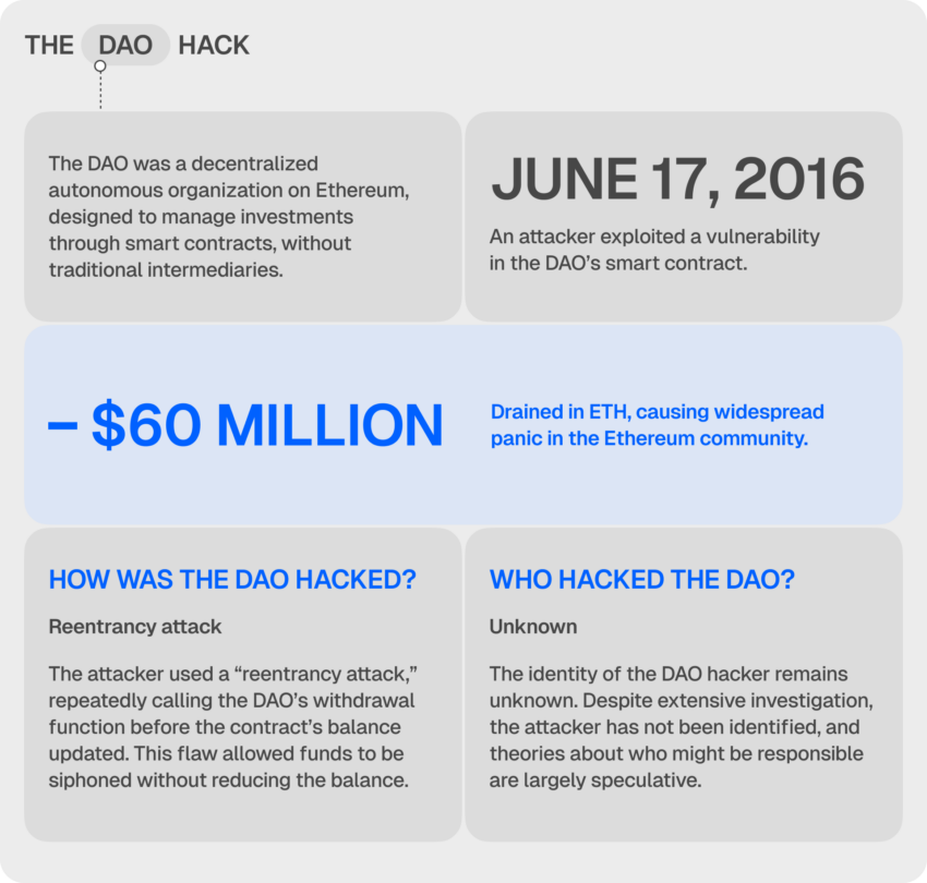 Pero, dahil sa butas sa code nito, nagawa ng isang attacker na ma-drain ang halos isang-katlo ng pondo. Dahil dito, kinailangan ng Ethereum community na magdesisyon: i-roll back ang chain para ma-recover ang ninakaw na pondo o panindigan na ang blockchains ay dapat hindi nababago.