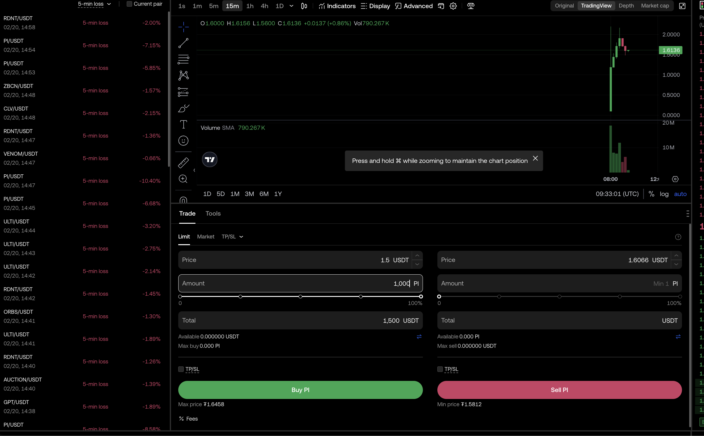 - Pumunta sa trading section at hanapin ang PI/USDT trading pair.