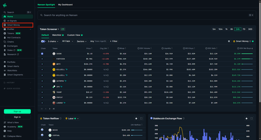 Isa pang paraan para mag-whale watch ay sa pamamagitan ng mga platform na nag-specialize sa pag-track ng smart money, tulad ng Nansen. Ang Nansen.ai ay isang crypto analytics platform na tumutulong sa mga investors na gumawa ng mas matalinong desisyon sa pamamagitan ng pagpapakita kung sino ang gumagawa ng ano sa blockchain. Nilalagyan nito ng label ang mga wallets, tina-track ang malalaking players, at nagbibigay sa mga user ng madaling basahin na dashboards at alerts para makakita ng bagong opportunities at maiwasan ang risks.
