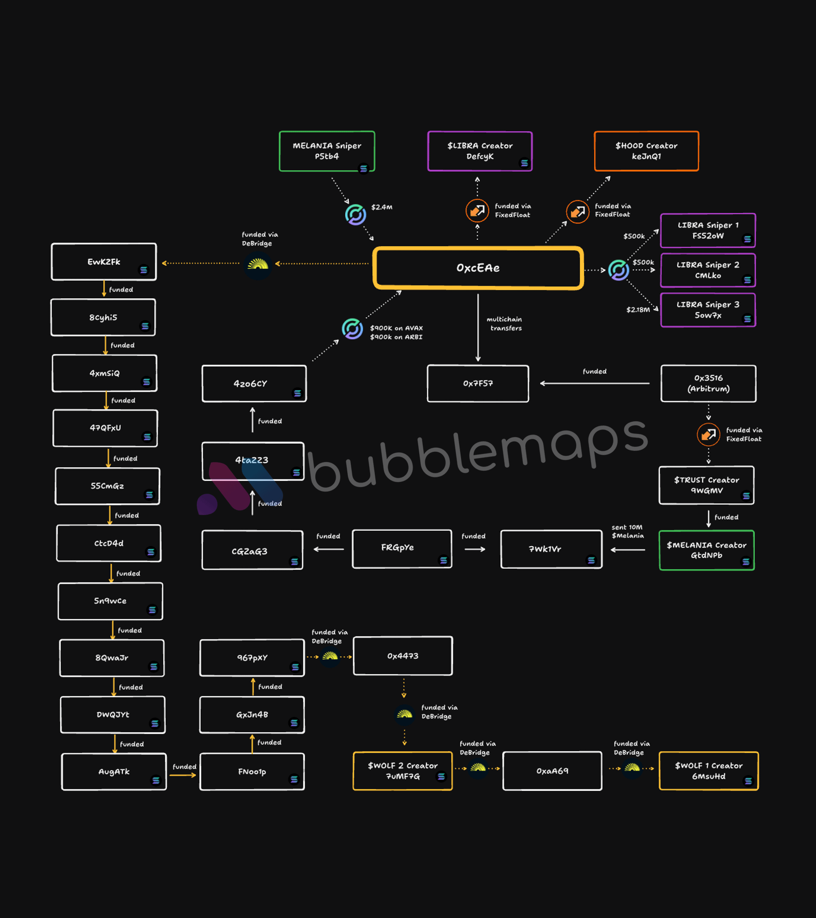 “Simula sa WOLF creator na 6MsuHd, sinundan namin ang mga funding transfers pabalik sa 17 addresses at 5 cross-chain transfers. Lahat ay humantong sa isang address: OxcEAe. Ang parehong address na pagmamay-ari ni Hayden Davis,” ayon sa Bubblemaps.