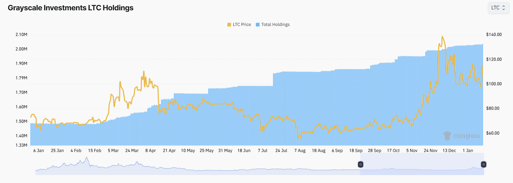 Base sa Coinglass data, ang Trust ay may hawak na mas mababa sa 1.5 million LTC coins noong January 2024. Isang taon ang lumipas, ang holdings ng investment giant ay tumaas sa mahigit 2 million. Ang galaw ng Grayscale ay nagsa-suggest na inaasahan ng kumpanya ang malakas na interes ng mga investor sa Litecoin.