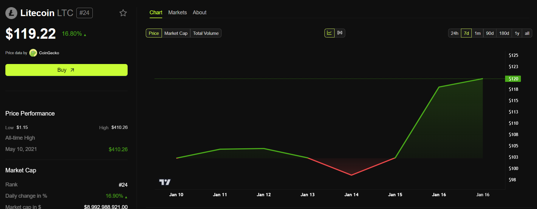 Ang balita tungkol sa ETF ay nagpa-boost sa presyo ng Litecoin kung saan ang LTC ay nagte-trade sa $119.22 sa oras ng pag-publish. Tumaas ng 16.8% ang presyo ng crypto sa nakaraang 24 oras.