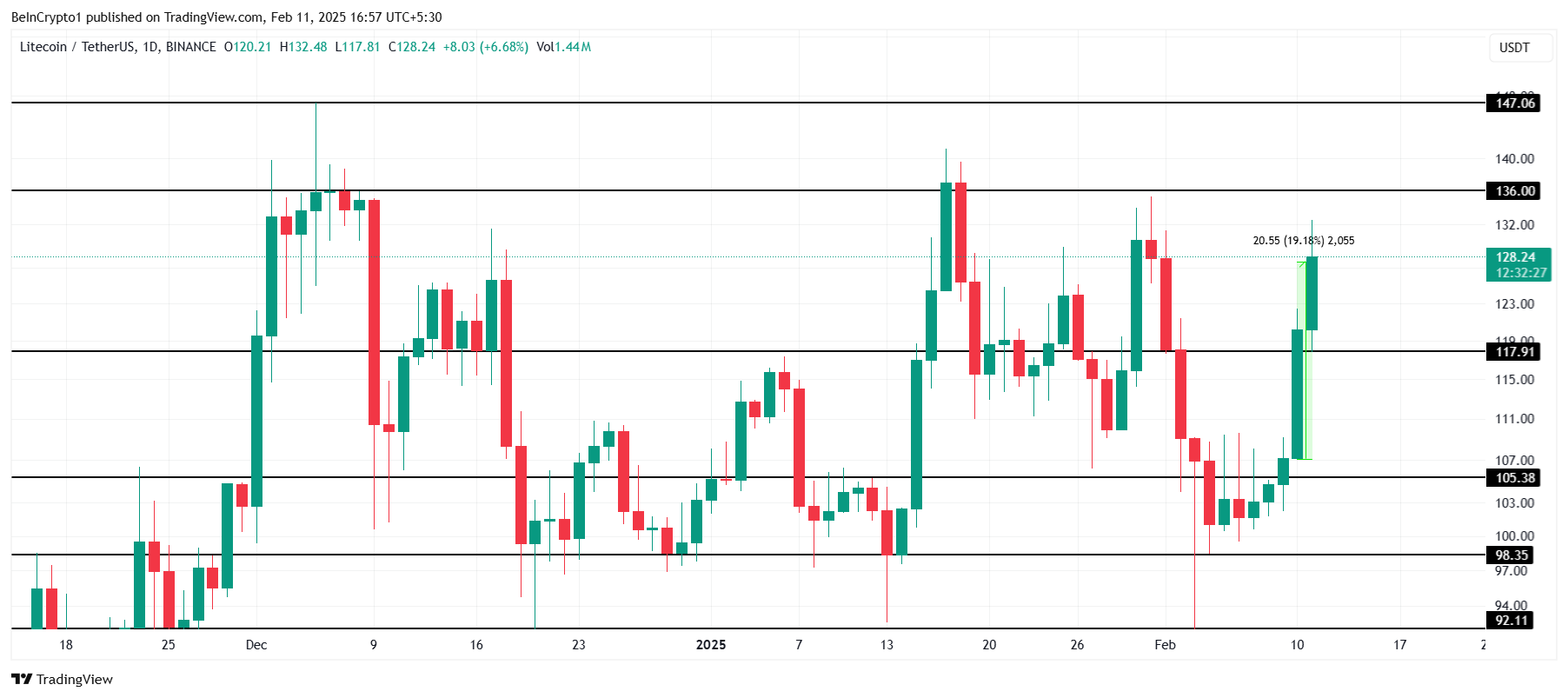 Ang presyo ng Litecoin ay kasalukuyang tumaas ng 10% sa nakaraang 24 oras, nasa $127. Ang LTC ay nasa loob ng range ng mahalagang $136 na hadlang. Ang resistance level na ito ay naging mahirap para sa Litecoin na malampasan sa nakaraang dalawang buwan.