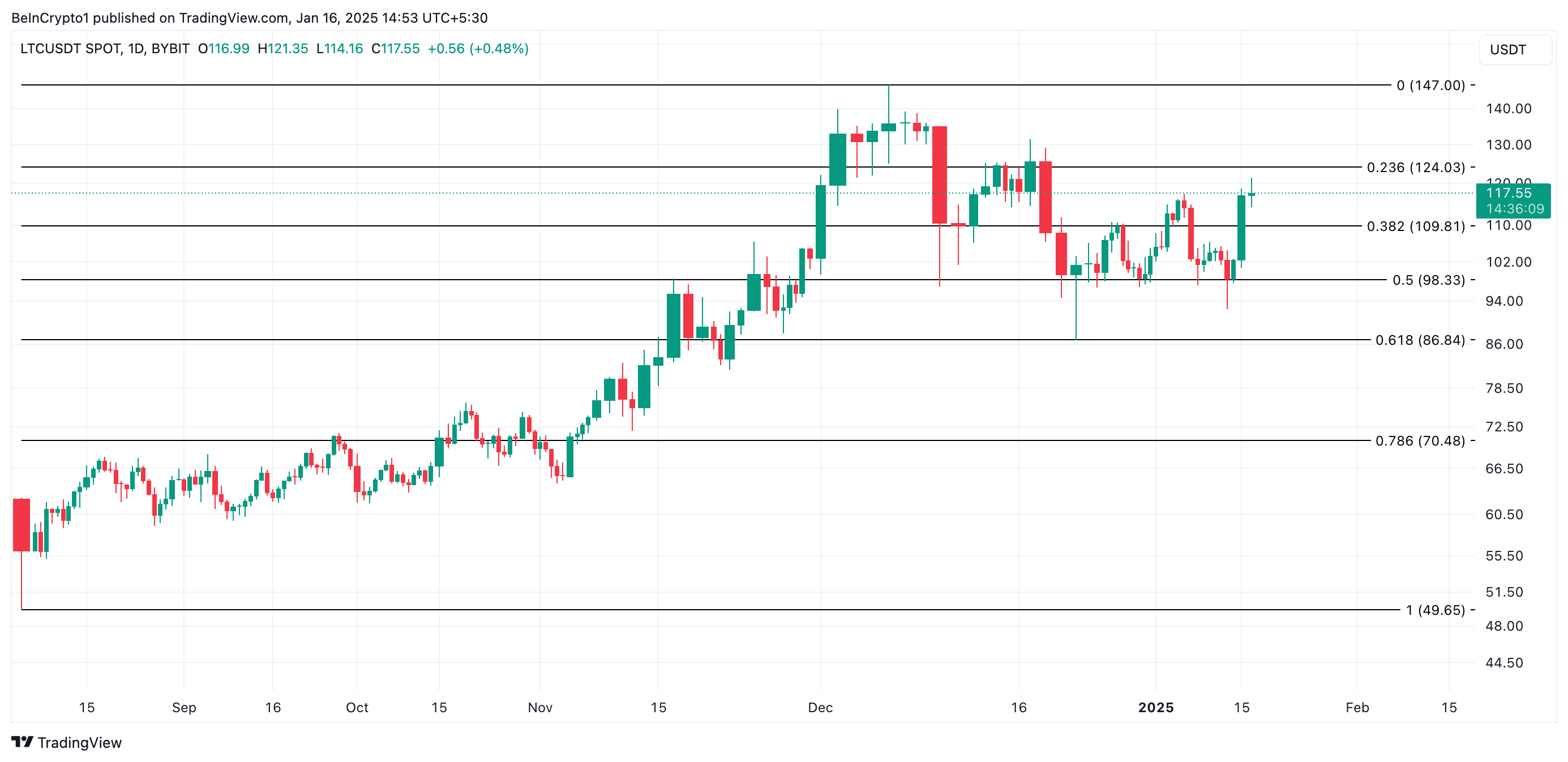 Ang whale accumulation na ito ay nag-trigger ng rally sa value ng LTC. Sa kasalukuyang trading price na $117.55, ang altcoin ay nakapagtala ng 15% na pagtaas sa nakaraang pitong araw.