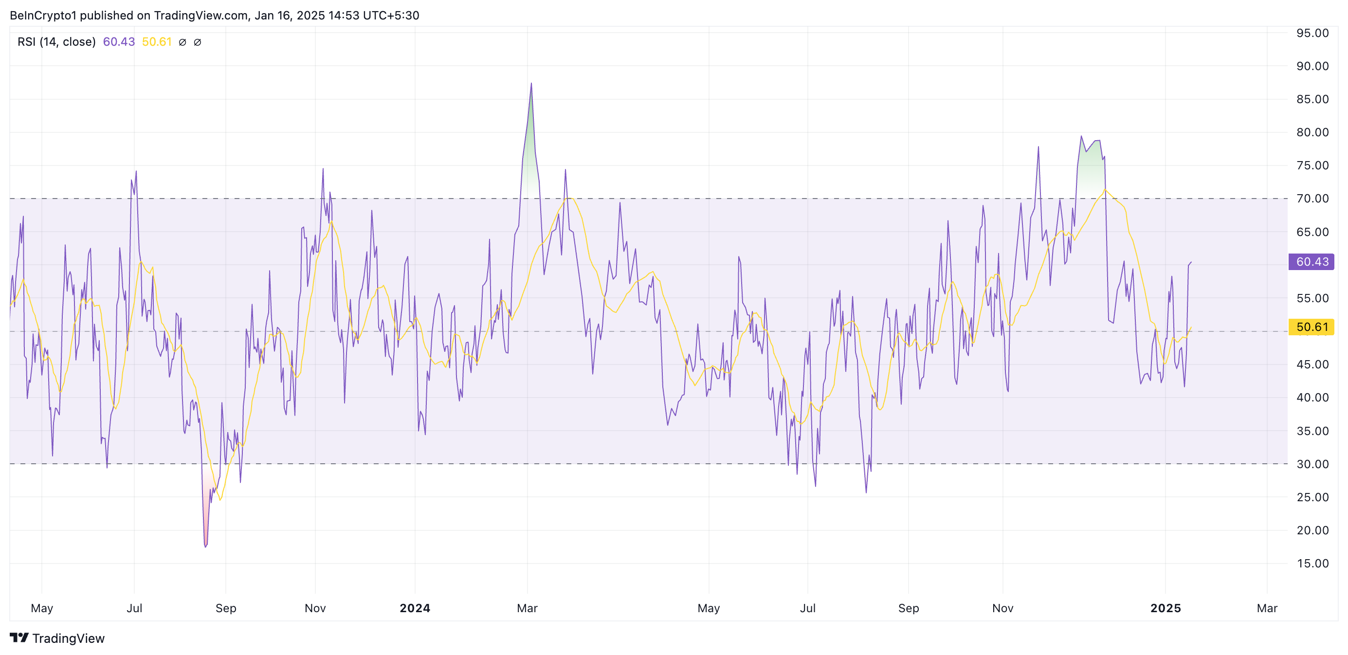 Ang momentum indicator na ito ay sumusukat sa overbought at oversold market conditions ng isang asset. Ito ay nagra-range mula 0 hanggang 100, kung saan ang values na higit sa 70 ay nagpapahiwatig na ang asset ay overbought at maaaring magdulot ng correction. Sa kabilang banda, ang values na mas mababa sa 30 ay nagsasaad na ang asset ay oversold at maaaring makaranas ng rebound.