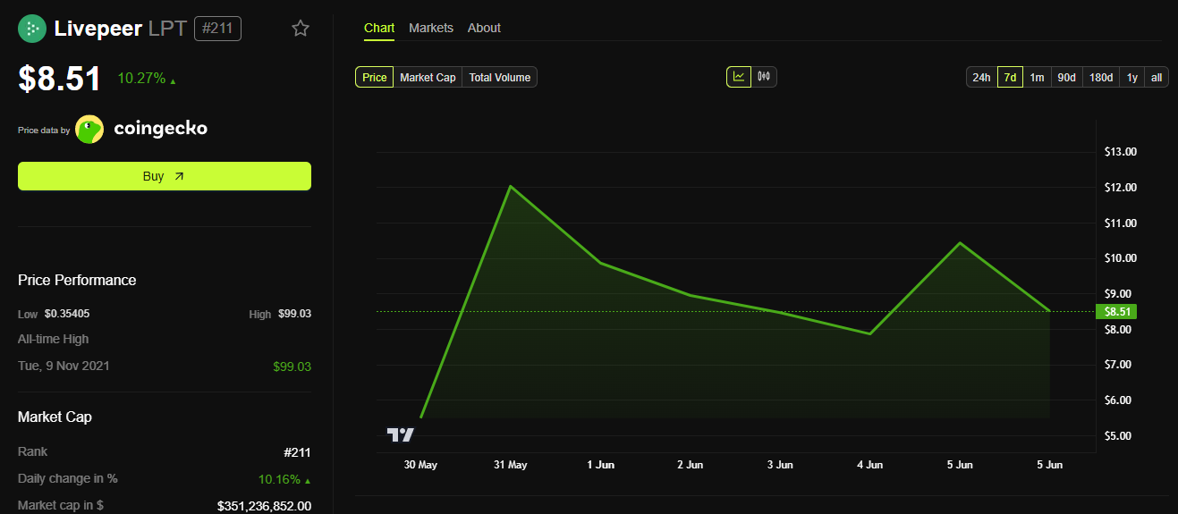 Ang native token ng Livepeer, ang LPT, ay nakaranas ng matinding pagtaas. Noong Hunyo, tumaas ito ng 150% at umabot sa apat na buwang high na $14.20.