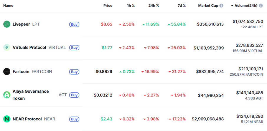 Sa kasalukuyan, ang trading volume ng LPT ay lampas pa rin sa $1 billion. Ayon sa CoinMarketCap, nalampasan nito ang Virtual Protocol para maging pinakamataas na volume na AI token sa market, na nagpapakita ng matinding interes mula sa mga trader.