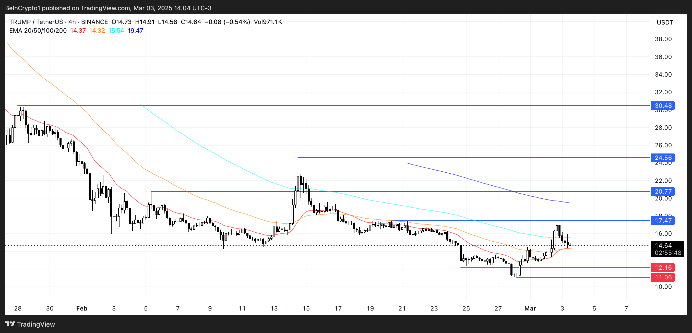 Gayunpaman, kung magpatuloy ang correction, posibleng i-test ng TRUMP ang suporta sa $12.1 o $11, na may break sa ilalim ng $11 na magmamarka ng pinakamababang presyo nito mula nang ilunsad.