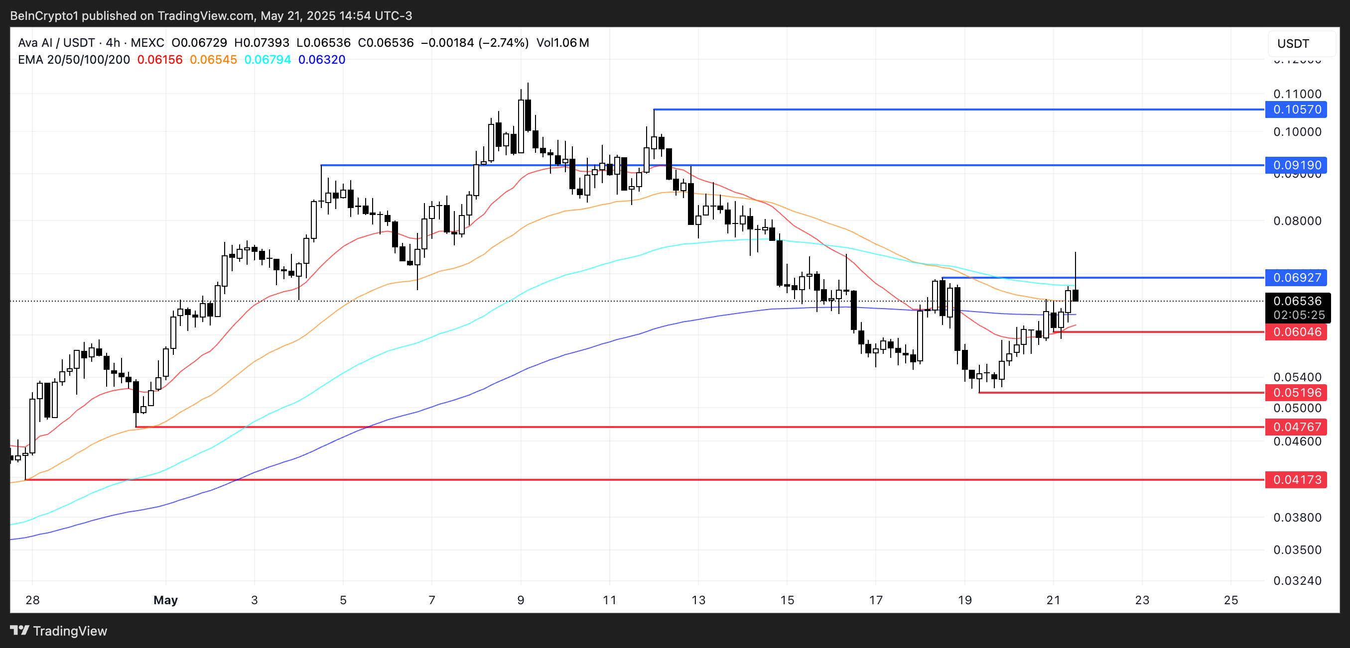 Ang mga technical indicator ay nagiging bullish, at ang EMA lines ng AVA ay nagsa-suggest na posibleng mag-form ang golden cross soon. Kung magpapatuloy ang momentum, puwedeng umakyat ang token para i-test ang resistance sa $0.069, at ang breakout ay maaaring magbukas ng daan patungo sa $0.0919 at kahit $0.015.