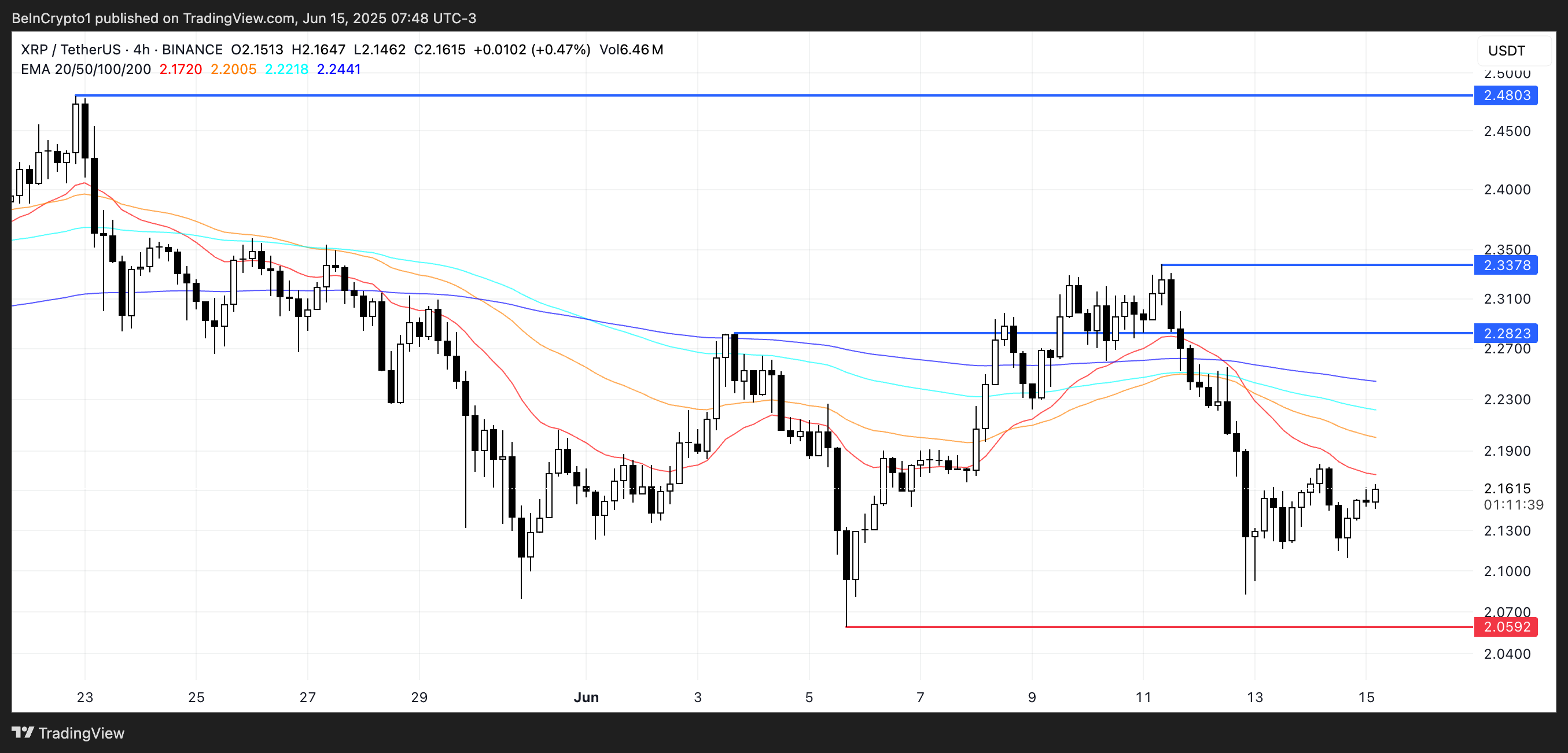 Technically, nananatili sa bearish configuration ang Exponential Moving Averages (EMAs) ng XRP, kung saan ang short-term lines ay nasa ilalim pa rin ng long-term ones.