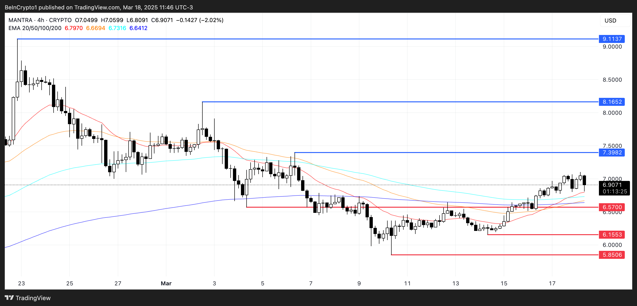 Kung makumpirma ang pattern na ito at maibalik ng Mantra ang malakas na uptrend na nakita sa mga nakaraang buwan, maaari itong mag-breakthrough sa resistance levels na $7.39 at $8.16.