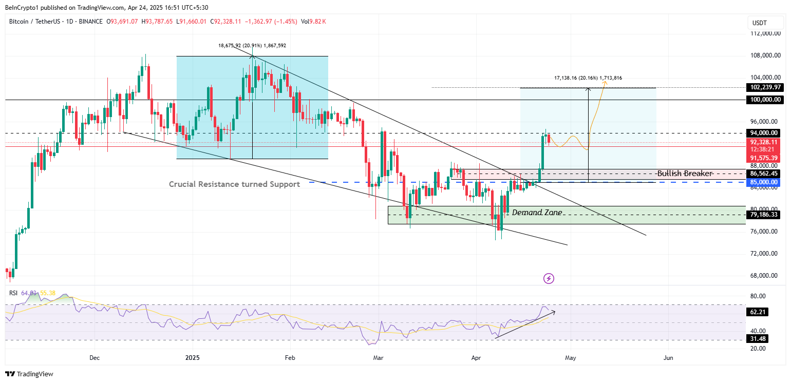 Ayon sa isang BeInCrypto analysis, kung mag-hold ang support level na ito, posibleng ma-target ng Bitcoin ang $100,000 psychological level pagkatapos malampasan ang resistance sa $94,000.