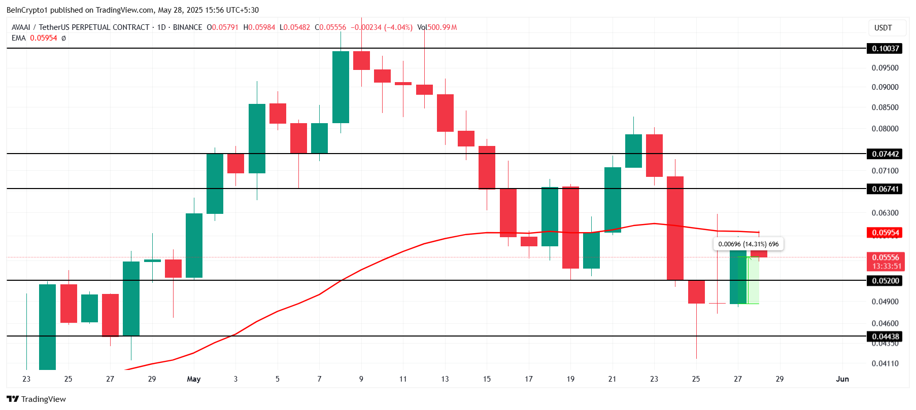 Pero, ang 50-day EMA ay nagsisilbing resistance ngayon, na nagpapakita ng short-term na bearish pressure. Kung babagsak ang AVA sa ilalim ng $0.052 support, pwede itong bumaba hanggang $0.044, na mag-i-invalidate sa bullish outlook at nagsa-suggest ng mas malaking downside risk para sa mga trader.