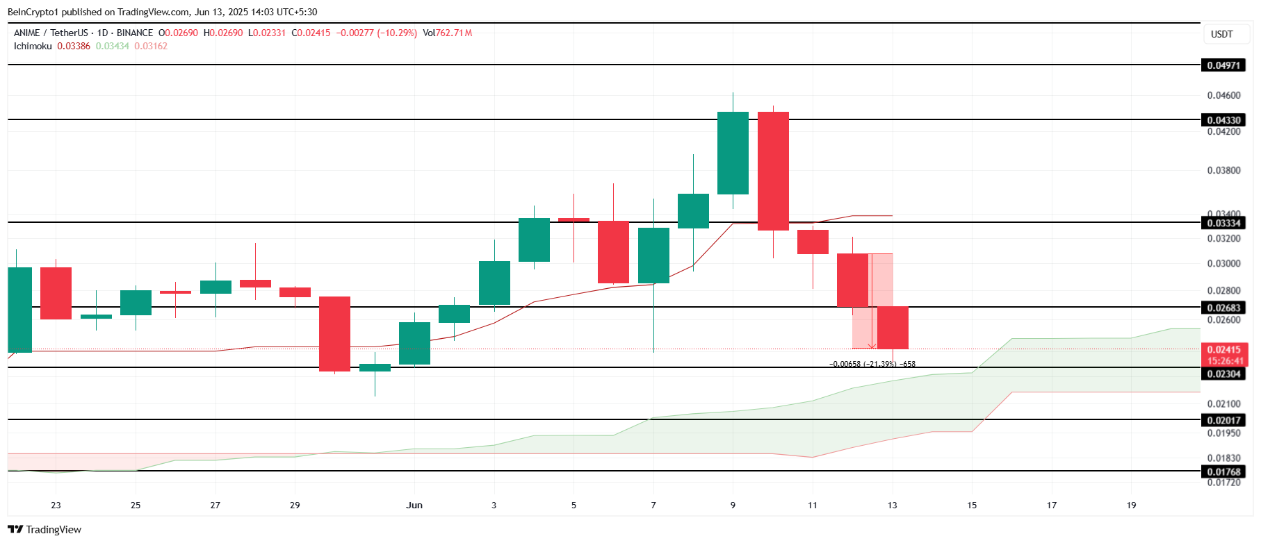 Bumagsak ng 21.3% ang ANIME, isa sa mga pinakamalaking talo ngayong araw. Sa kasalukuyan, nagte-trade ito sa $0.0241, at ang meme coin ay nasa ibabaw ng critical support level na $0.0230. Pero ang patuloy na market conditions at behavior ng mga investor ay pwedeng makaapekto sa kakayahan ng altcoin na mapanatili ang support na ito.
