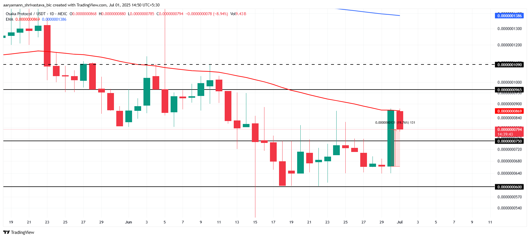 Kasalukuyang nakikipagkalakalan sa $ 0.0000000794, ang OSAK ay humahawak sa itaas ng mahalagang suporta ng $ 0.0000000750. Ang meme coin ay nagta-target ng $ 0.0000000965, na magmamarka ng isang makabuluhang pagbawi ng mga pagkalugi nito sa Hunyo. Kung matagumpay na tumawid ang OSAK sa hadlang na ito, maaari itong makakita ng isang napapanatiling rally at makaakit ng karagdagang mga pamumuhunan sa merkado.