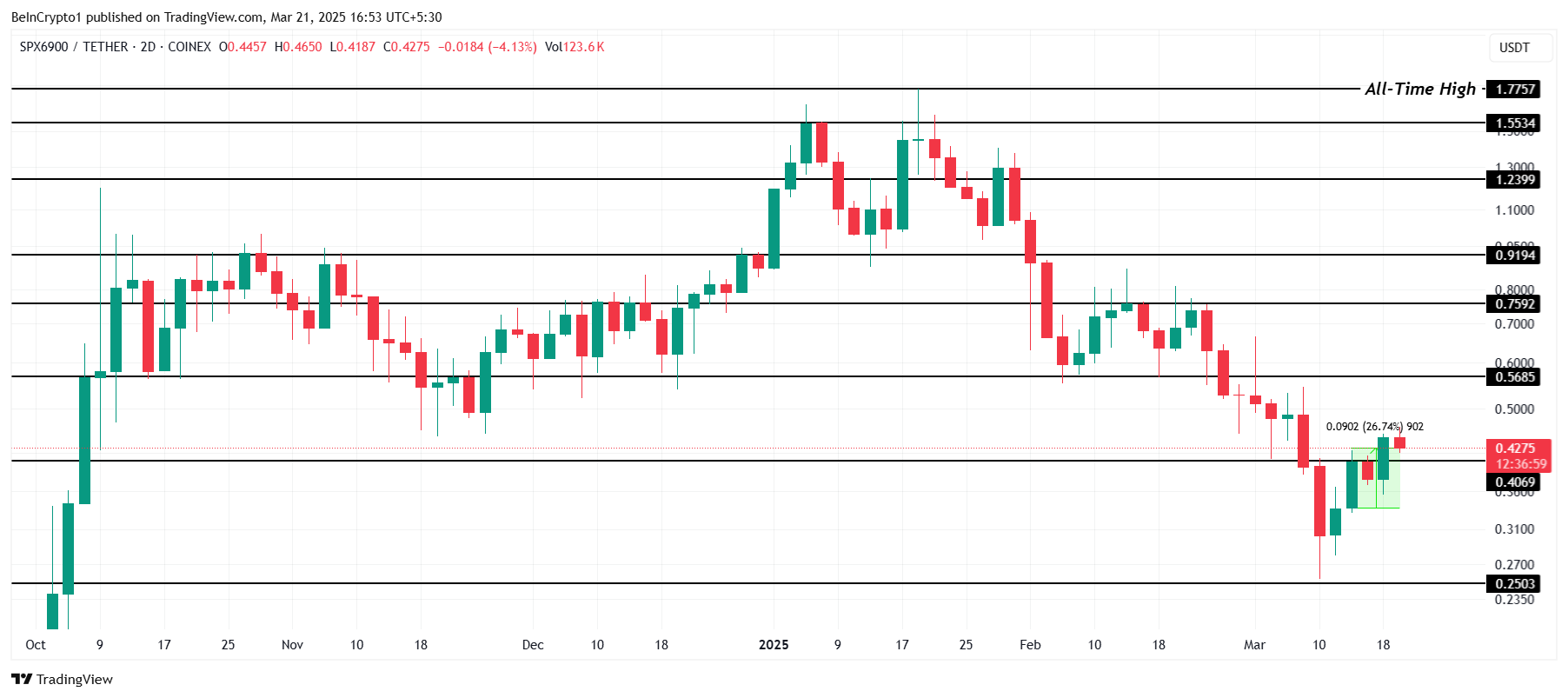 Maganda ang performance ng SPX ngayong linggo, na nagrehistro ng 26% na pagtaas. Ang altcoin ay nagte-trade sa $0.427 sa oras ng pagsulat, na nagpo-position sa sarili bilang isa sa mga top-performing tokens.
