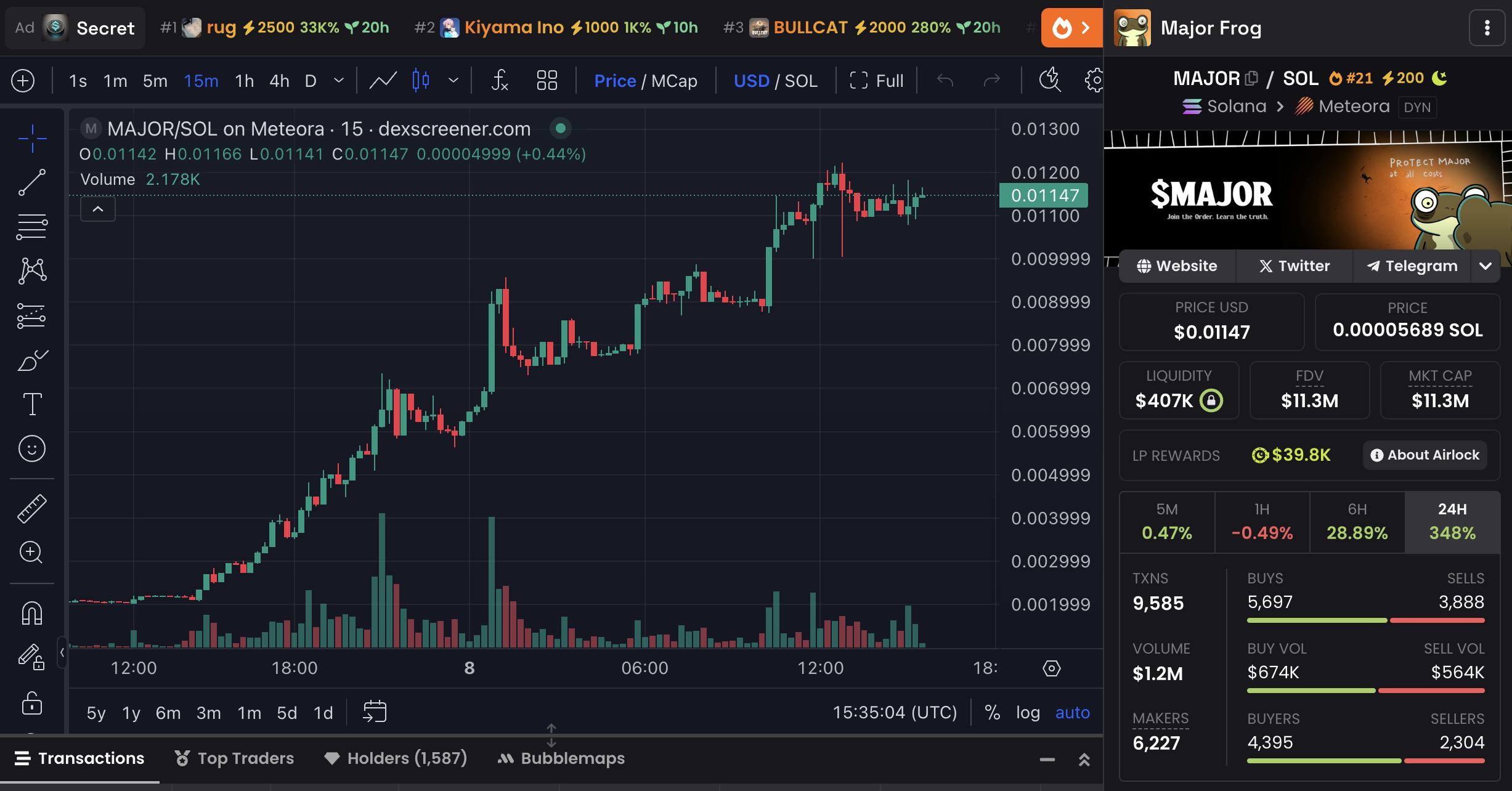 Dahil sa biglaang pagtaas na ito, ang market cap ng MAJOR ay umabot na sa $11 million, na nagpapakita ng tumataas na interes sa proyekto. Sa ngayon, ang bilang ng holders nito ay nasa halos 1,600, na patunay ng maagang pero solidong adoption.