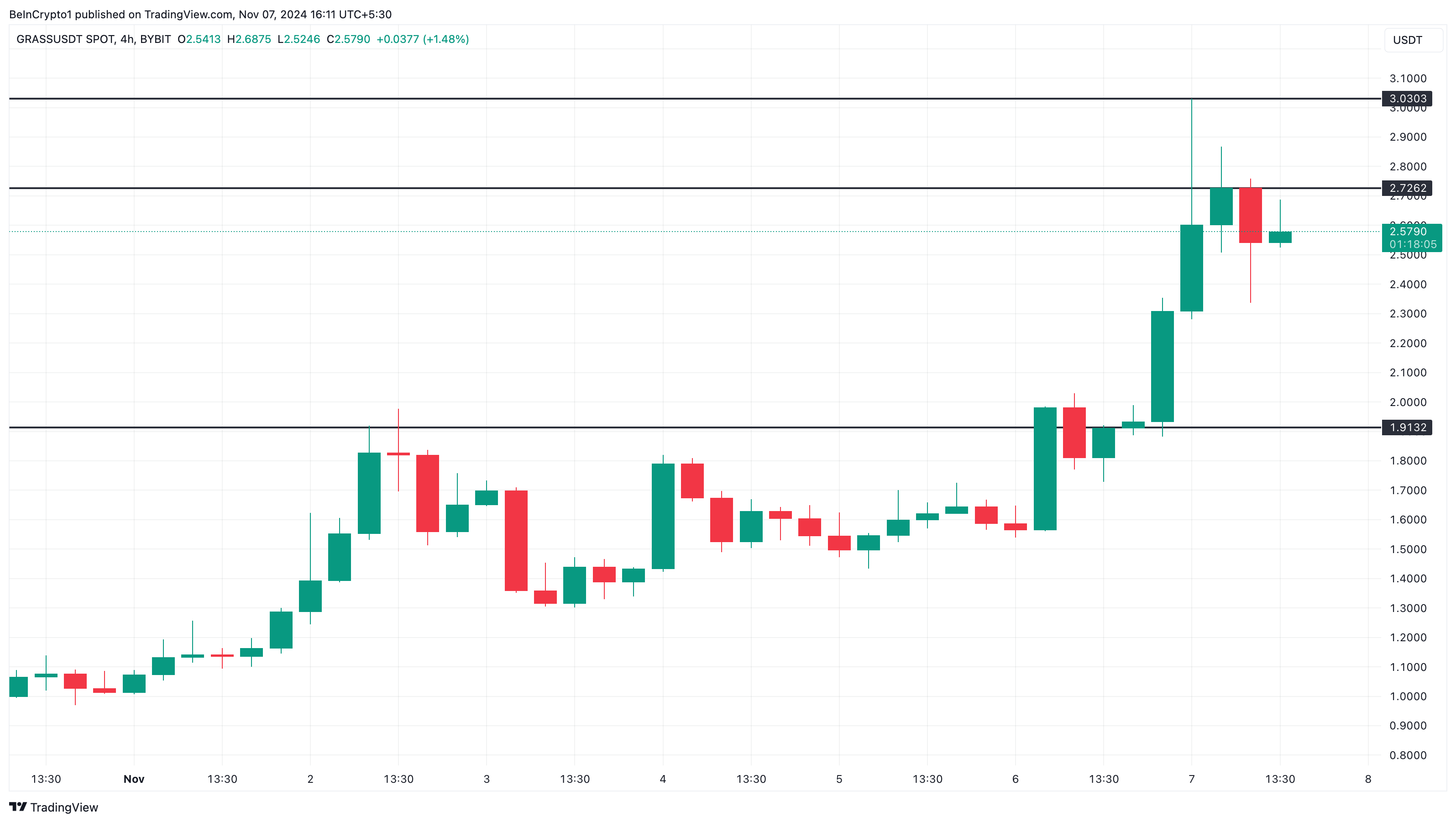 Sa ngayon, nasa $.2.60 ang presyo ng GRASS, at malapit na itong lumampas sa previous all-time high nito. Sa 4-hour chart, makikita na sinubukan na nitong lampasan ang $2.79, pero naharang ito sa $2.72, na nag-drag pabalik sa presyo nito.