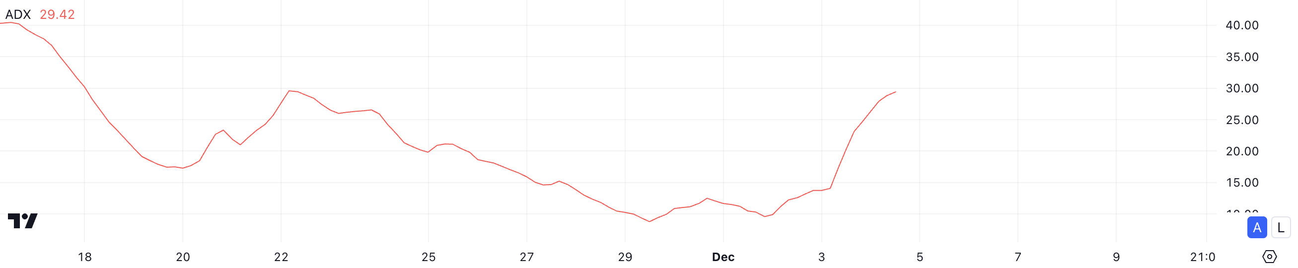Ang ADX (Average Directional Index) ay sumusukat sa lakas ng isang trend, kahit ano pa ang direksyon nito. Ang mga value sa ilalim ng 25 ay nagpapahiwatig ng mahina o nagko-consolidate na market, habang ang mga nasa itaas ng 25 ay nagpapakita ng malakas na trend.