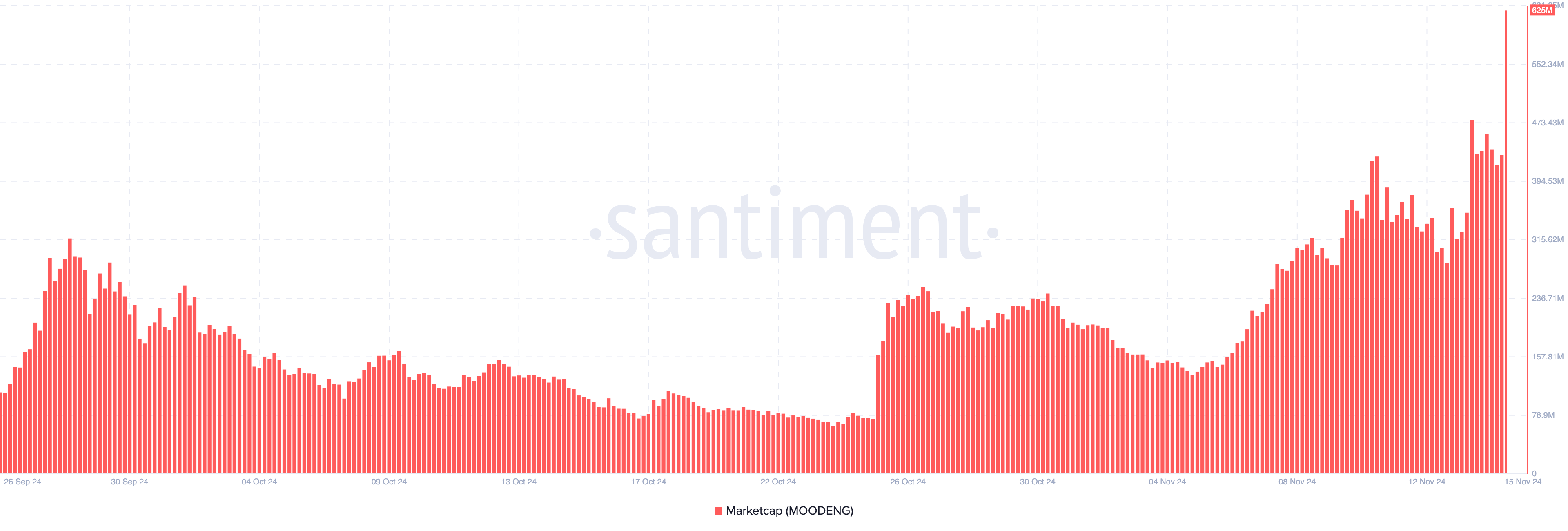 Noong Huwebes, Nobyembre 14, wala pang $300 million ang market cap ng Moo Deng. Pero, habang tumataas ang demand para sa hippo-themed meme coin, umakyat ang presyo mula $0.35 hanggang $0.62.