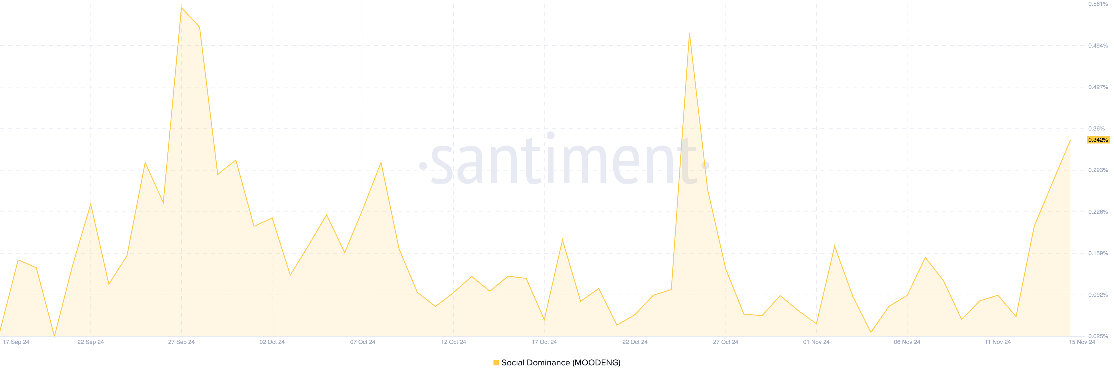 Bukod dito, ipinapakita ng on-chain data ang malaking pagtaas sa social dominance ng token. Ang social dominance ay sumusukat sa proporsyon ng mga diskusyon na nakatuon sa isang partikular na asset.