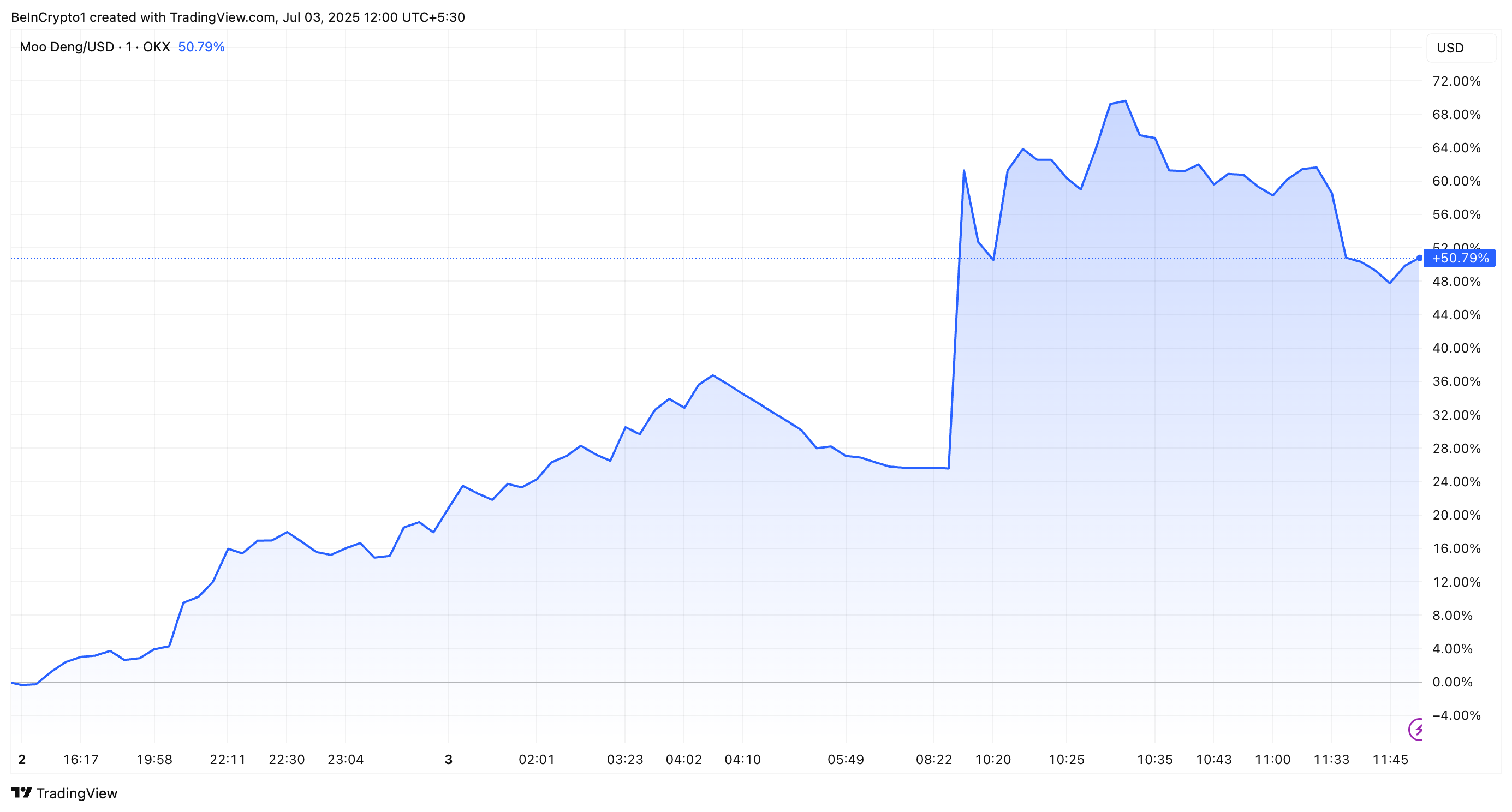 Ang Moo Deng (MOODENG), isang meme coin na nakabatay sa Solana na inspirasyon ng viral na sanggol na pygmy hippo ng Thailand, ay nakasaksi ng isang kapansin-pansin na pagtaas ng presyo ng higit sa 39%.