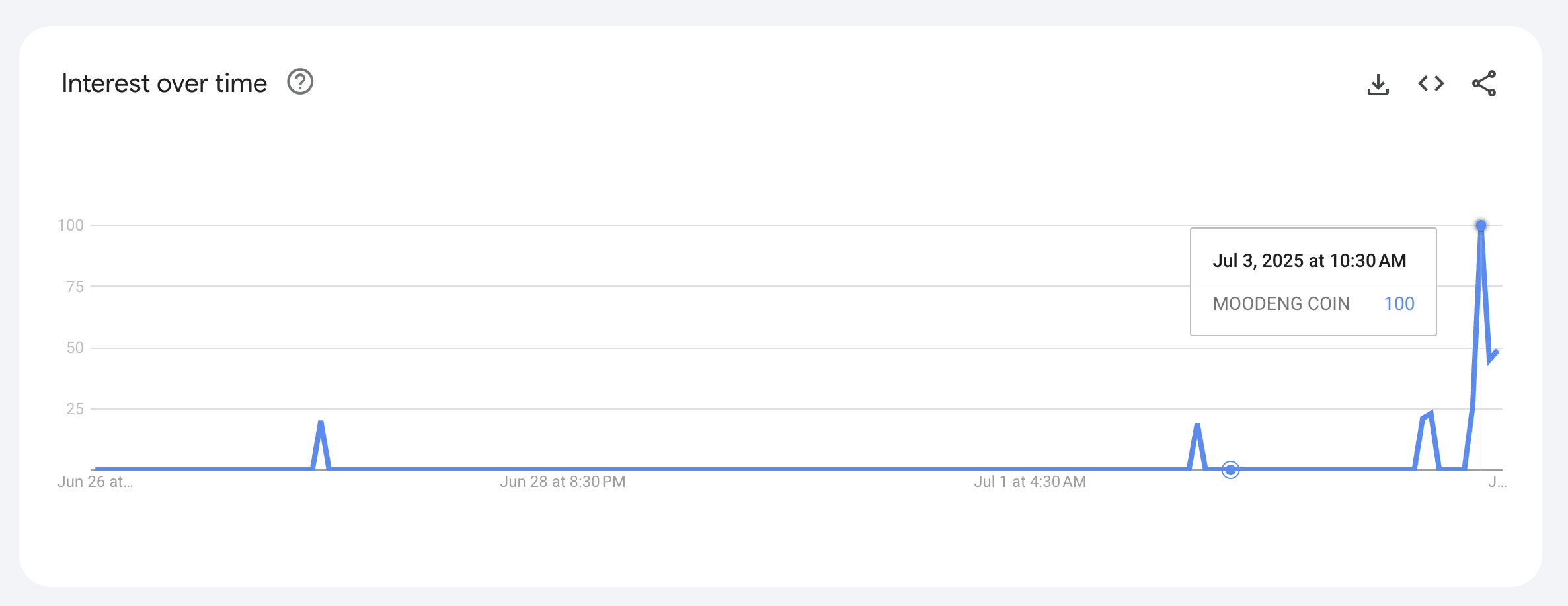 Ipinakita rin ng data ng Google Trends na ang interes sa paghahanap para sa “MOODENG COIN” ay umabot sa 100 mas maaga ngayon. Ipinapakita nito ang matinding interes ng publiko sa token.