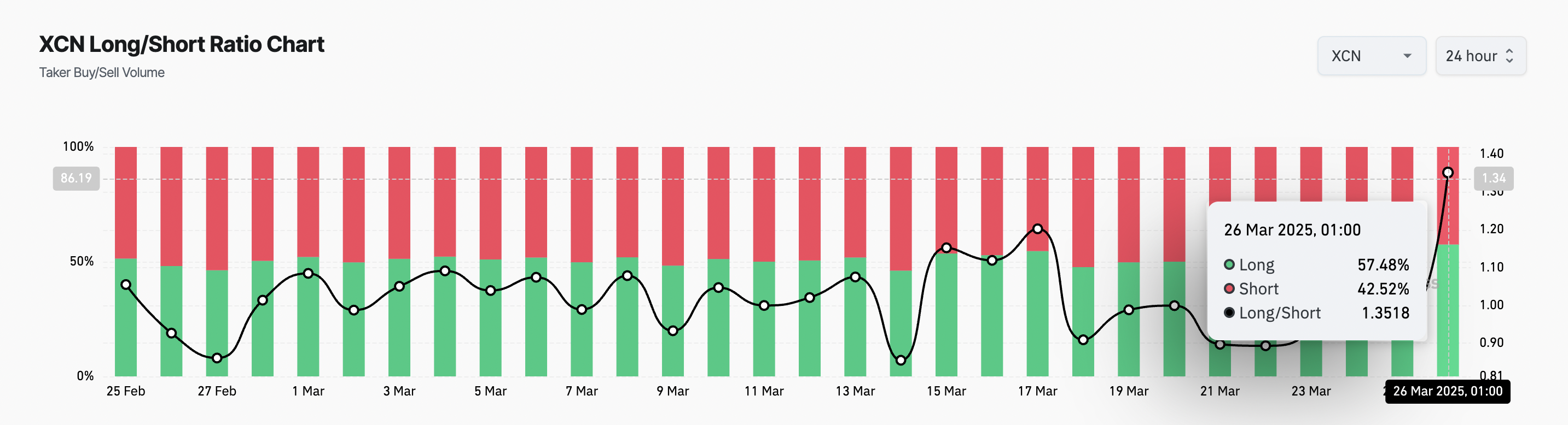 Ipinapakita ng on-chain data na tumataas ang demand para sa long positions, na nagpapahiwatig ng muling pagtaas ng kumpiyansa ng mga trader. Sa kasalukuyan, ang long/short ratio ng XCN ay nasa 1.35, ang pinakamataas nito sa mahigit 30 araw.