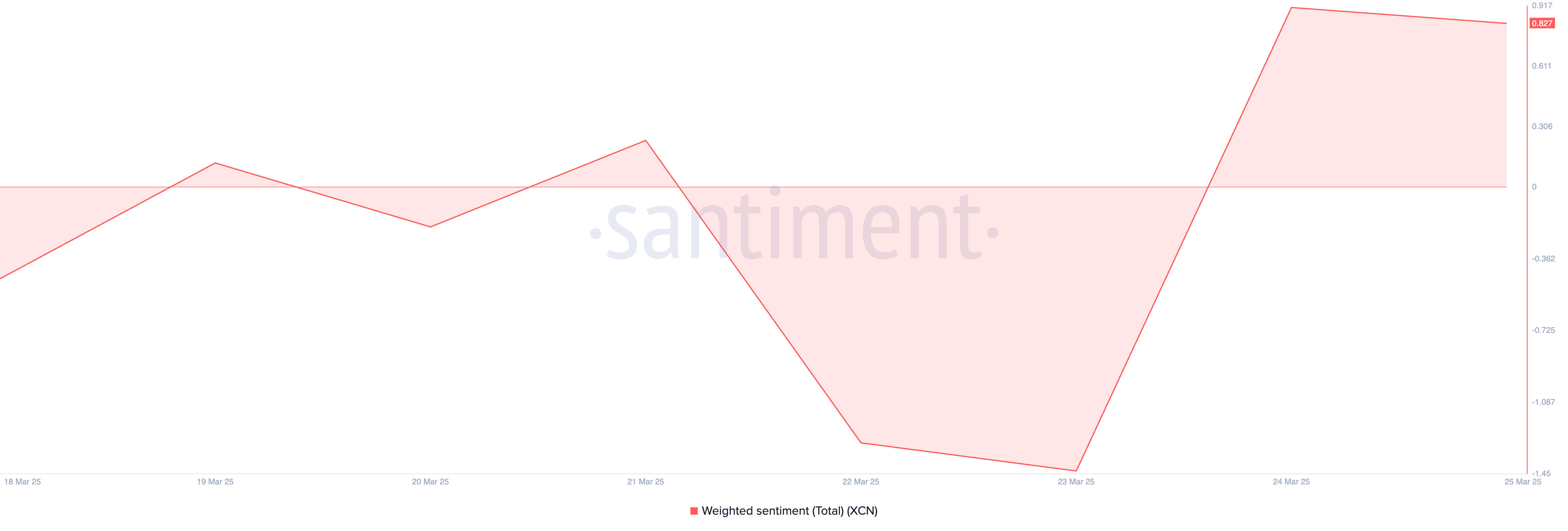 Dagdag pa rito, positibo ang weighted sentiment ng token, na lalo pang nagpapatibay sa ideya na tumataas ang kumpiyansa ng mga investor sa short-term recovery ng XCN. Sa kasalukuyan, ang on-chain metric na ito ay nasa 0.82.