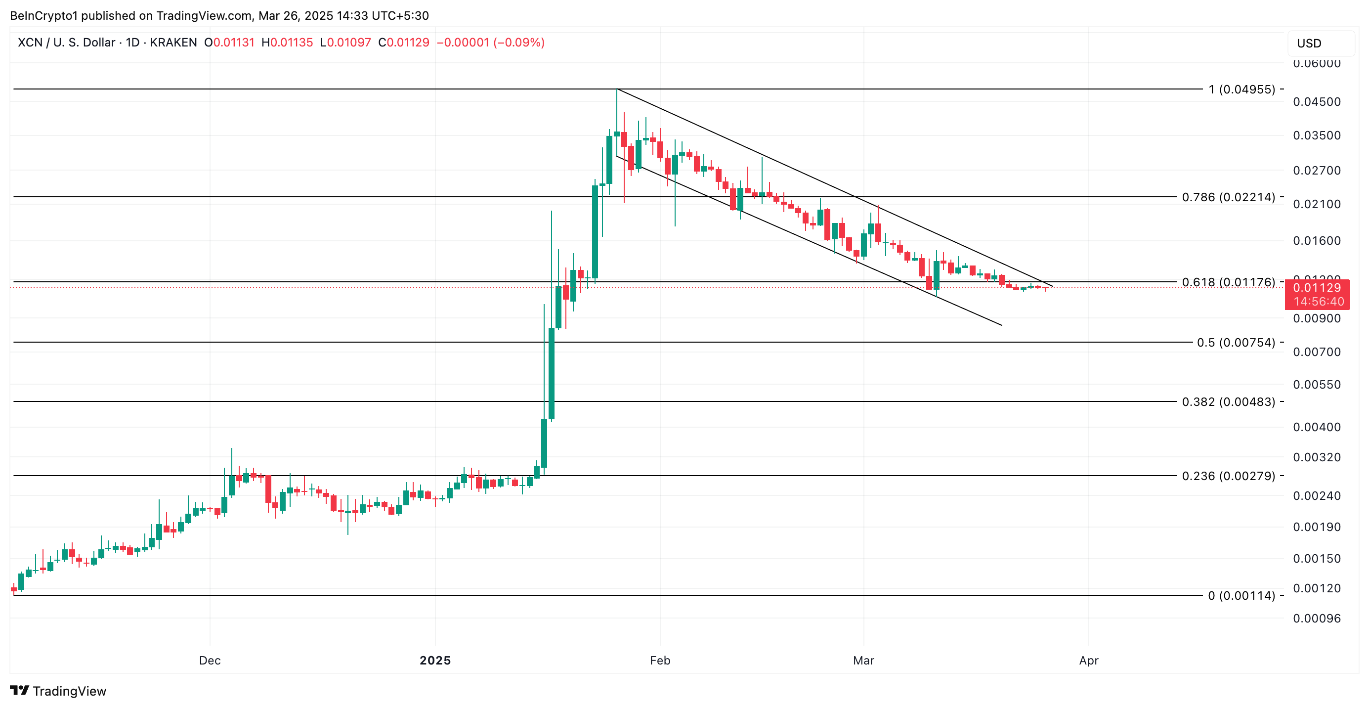 Sa daily chart, ang XCN ay nakahanda na mag-break sa ibabaw ng upper trend line ng descending channel na nagpababa sa presyo nito mula noong January 26.