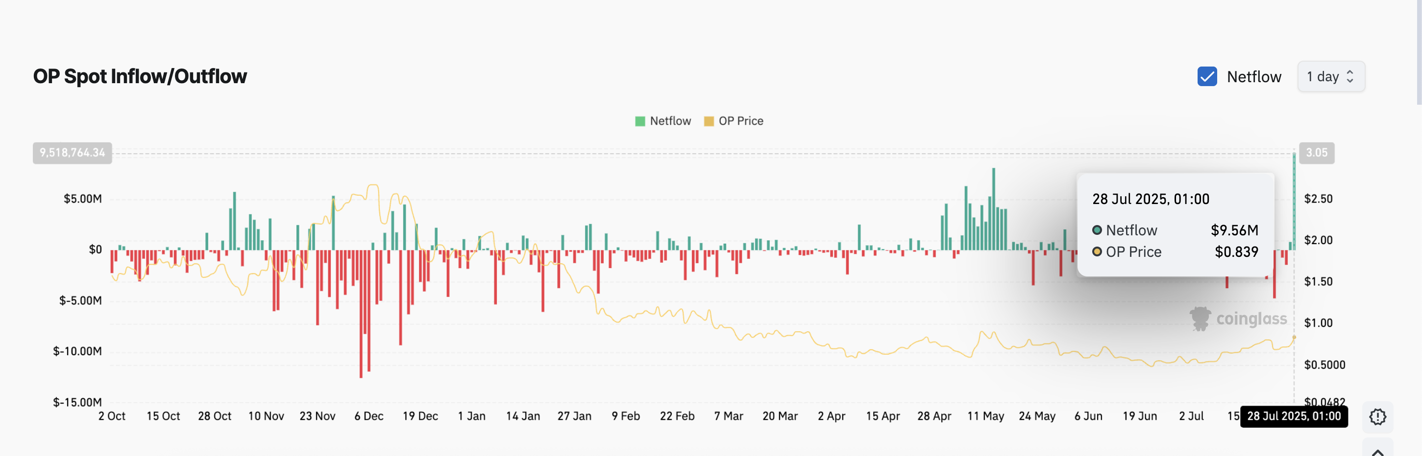 Dagdag pa rito, ang spot netflow ng OP ay kasalukuyang nasa multi-month high na $9.56 milyon, isang senyales ng lumalaking demand at pagtaas ng trading activity sa paligid ng altcoin.