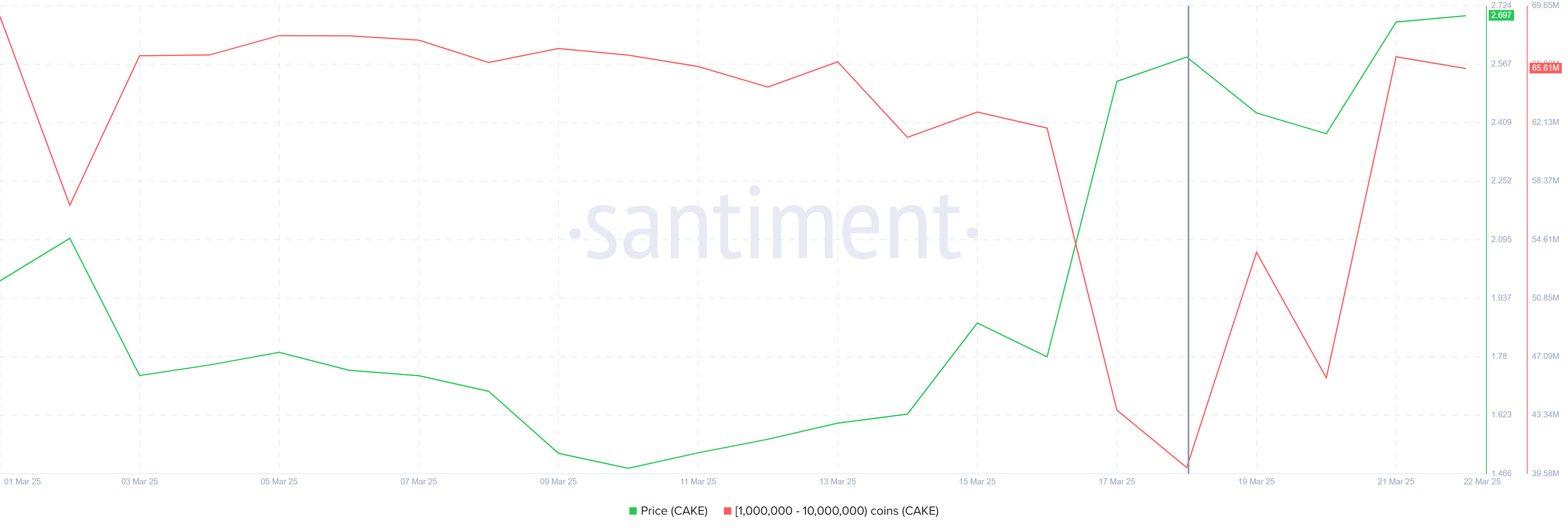 Sa nakaraang apat na araw, ang mga whale address ay nag-ipon ng 25 milyong CAKE tokens na nagkakahalaga ng humigit-kumulang $69 milyon. Ang malaking pag-iipon na ito ay kasunod ng 50% na pagtaas ng presyo sa nakaraang linggo, na lalo pang nagpapalakas sa positibong market sentiment.