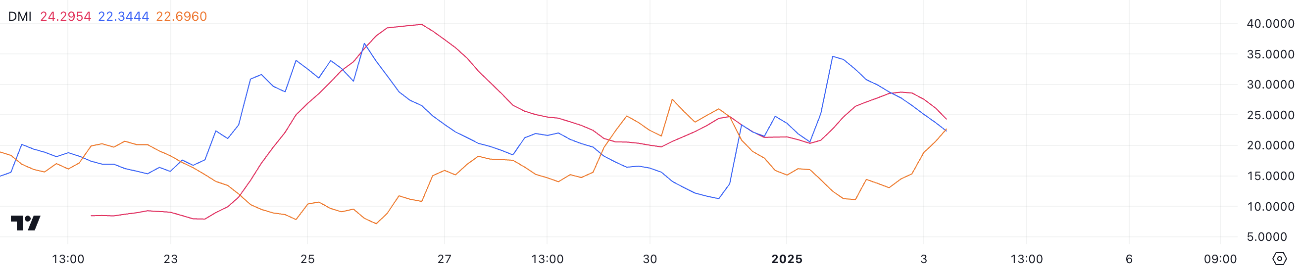 Ang +DI (Directional Indicator) ay bumaba sa 22.3 mula 34.6 dalawang araw lang ang nakalipas, na nagpapahiwatig ng pagbaba ng buying pressure, habang ang -DI ay tumaas sa 22.6 mula 11.2, na nagpapakita ng pagtaas ng selling pressure, na posibleng magdulot sa PENGU na mawala ang pwesto nito bilang pangatlong pinakamalaking meme coin sa Solana sa WIF.