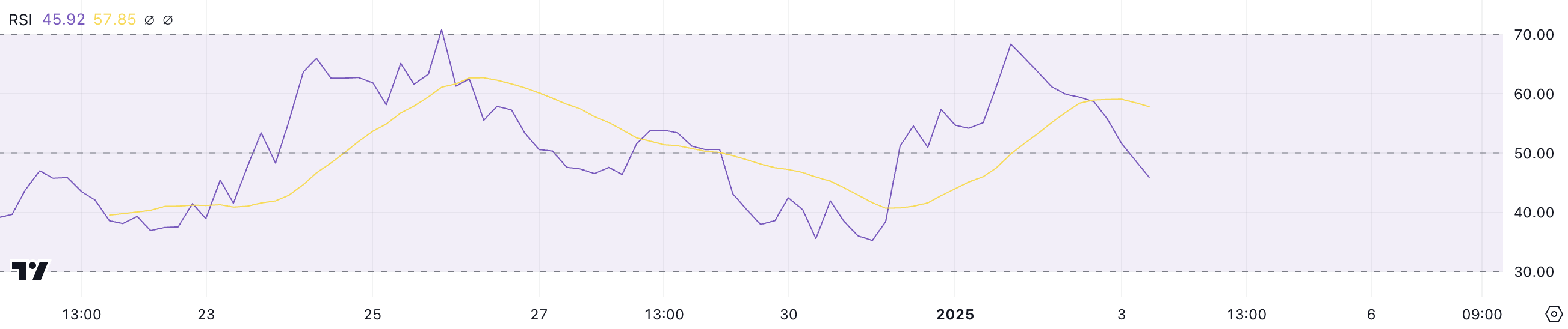 Ang RSI ay isang kilalang momentum indicator na sumusukat sa bilis at laki ng pagbabago ng presyo sa isang scale mula 0 hanggang 100. Ang mga reading na lampas sa 70 ay nagpapahiwatig ng overbought conditions, na madalas na senyales ng posibleng pullback, habang ang mga reading na mas mababa sa 30 ay nagmumungkahi ng oversold conditions at posibilidad ng rebound.