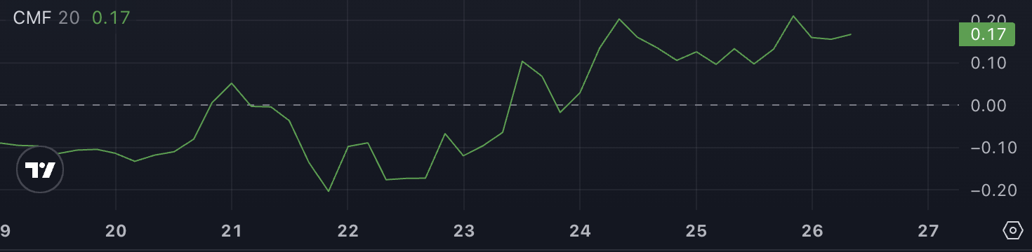 Habang ang CMF ay nananatiling positibo, ang bahagyang pagbaba ay nagsa-suggest na ang intensity ng capital inflows ay humina pero nagpapakita pa rin ng bullish market environment.