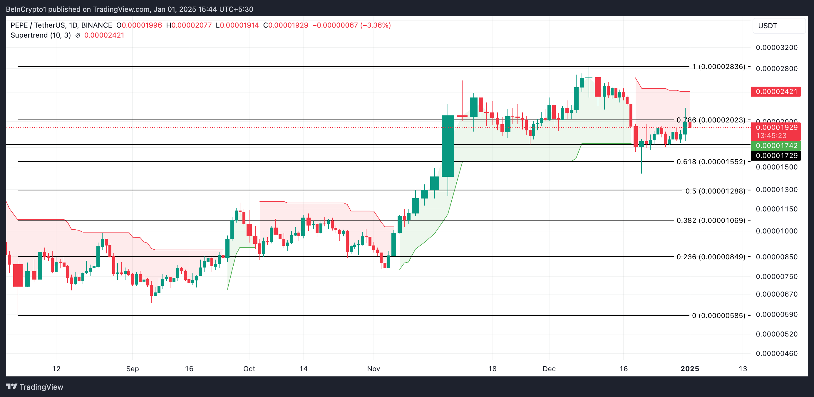 Sa daily chart, ang Super Trend Indicator ng PEPE ay nasa itaas ng presyo nito, na nagkukumpirma ng pagbaba ng demand. Ang indicator na ito ay nagta-track ng direksyon at lakas ng price trend ng isang asset. Ipinapakita ito bilang linya sa price chart, na nagbabago ng kulay para ipakita ang trend: green para sa uptrend at red para sa downtrend.