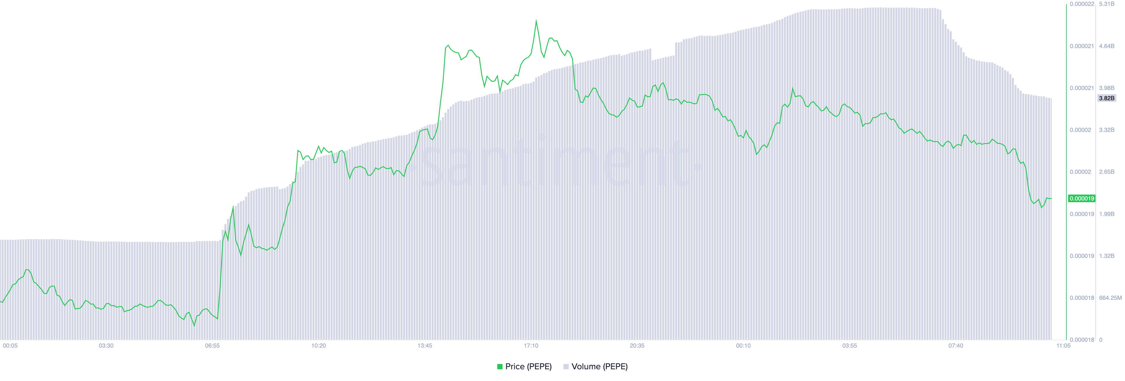 Dahil dito, nagkaroon ng surge sa optimism sa paligid ng PEPE meme coin, na nagdulot ng 12% na pagtaas ng value nito sa trading period. Pero, mukhang panandalian lang ang excitement na ito, dahil nagsimula nang bumaba ang meme coin. Sa nakalipas na 24 oras, bumaba ng 4% ang value nito.
