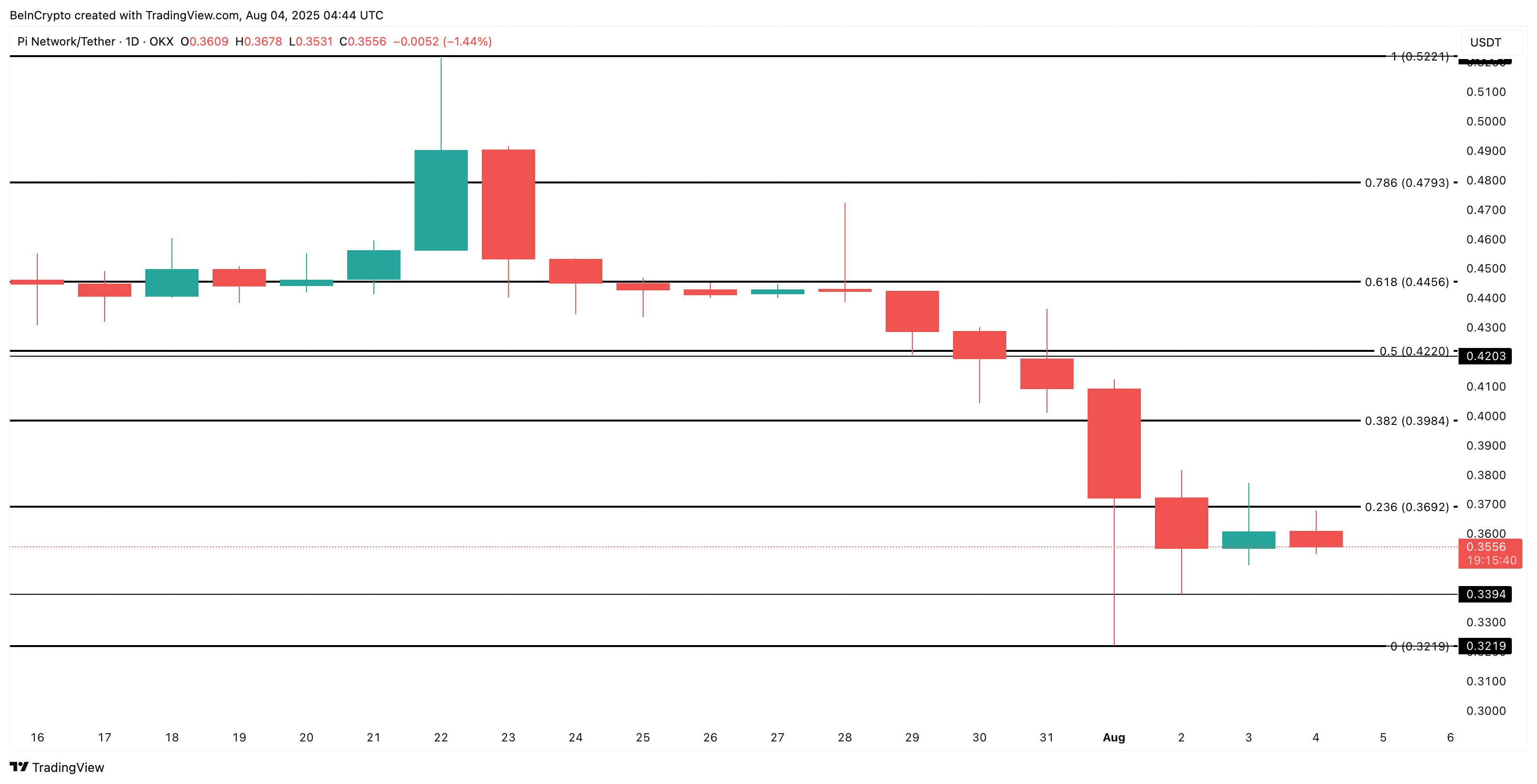 Ang presyo ng Pi Coin ay kasalukuyang nasa $0.35. Base sa Fibonacci retracement na iginuhit mula sa high noong July 22 ($0.52) hanggang sa low noong July 31 ($0.32), ang susunod na major resistance ay nasa $0.36, kasunod ang $0.39, at $0.42.