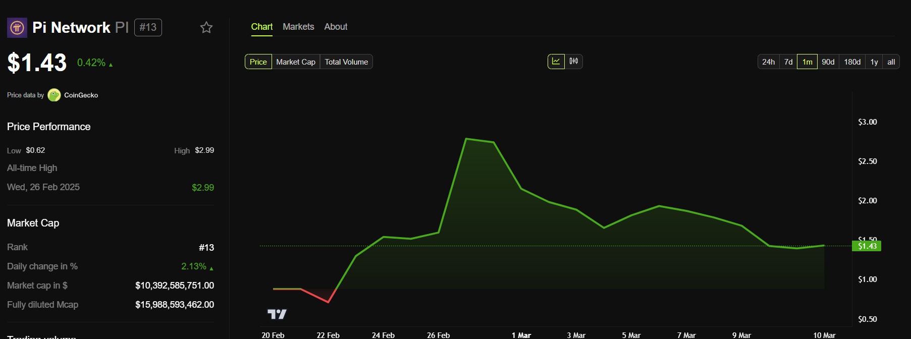 Sa kasalukuyan, ang PI coin ay nagte-trade sa $1.43, tumaas ng mas mababa sa 1% sa nakalipas na 24 oras.