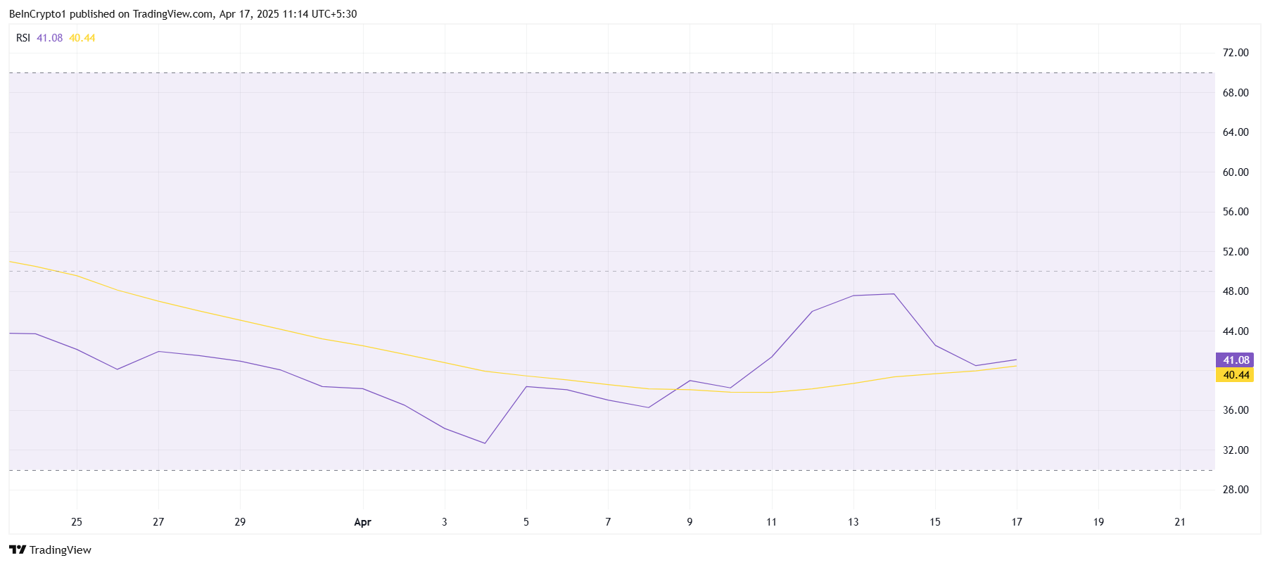 Patuloy na nagpapakita ang Relative Strength Index (RSI) na may bearish momentum pa rin. Kasalukuyang nasa ilalim ng neutral line na 50.0, ang RSI ay nagpapakita ng kakulangan ng bullishness para sa Pi Network. Ipinapahiwatig nito na ang altcoin ay maaaring makaranas ng karagdagang downward pressure sa mga susunod na araw.