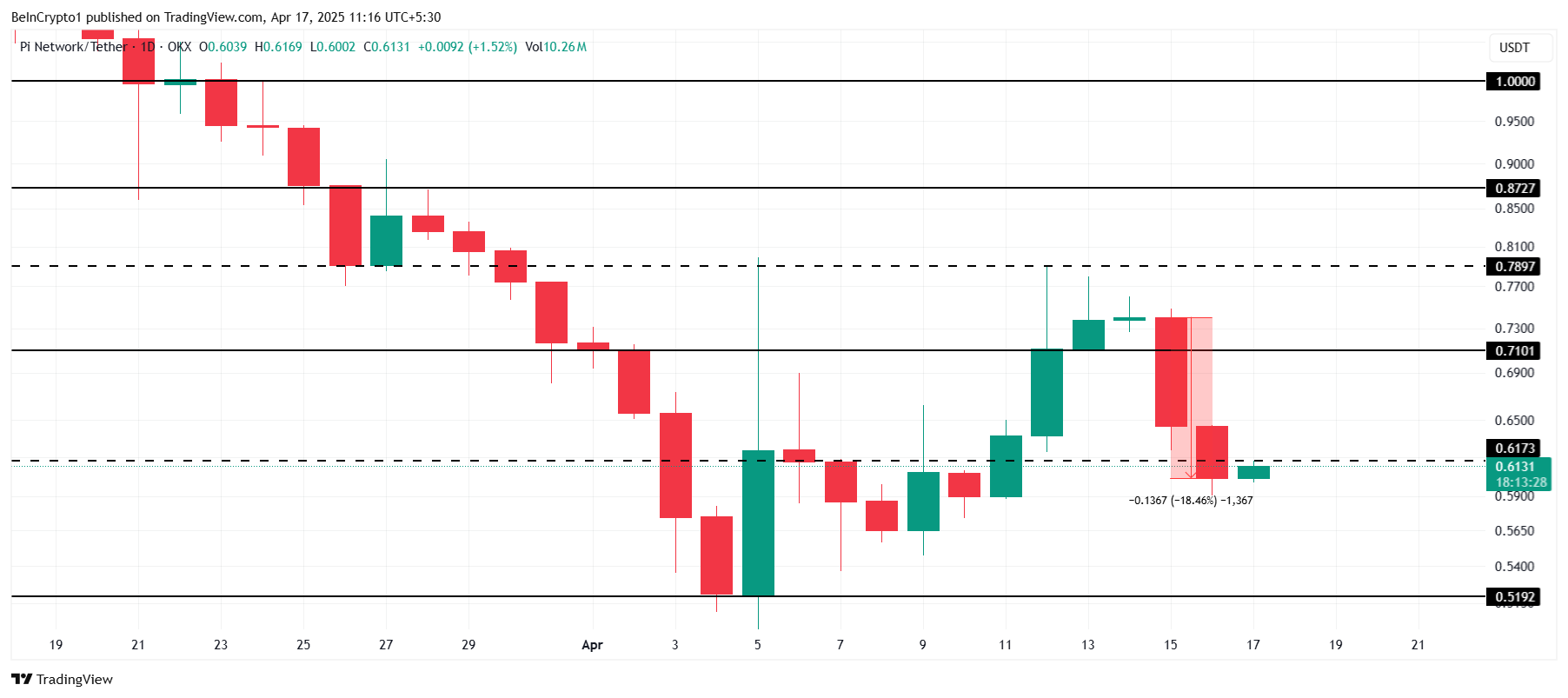 Ang presyo ng Pi Network ay kasalukuyang nasa $0.613, pero nananatiling nasa ilalim ng $0.617 resistance level. Matapos ang 18% na pagbaba sa nakaraang dalawang araw, ang altcoin ay nananatiling nasa pressure. Kung magpapatuloy ang downward momentum, maaaring mahirapan itong basagin ang mga key resistance levels.