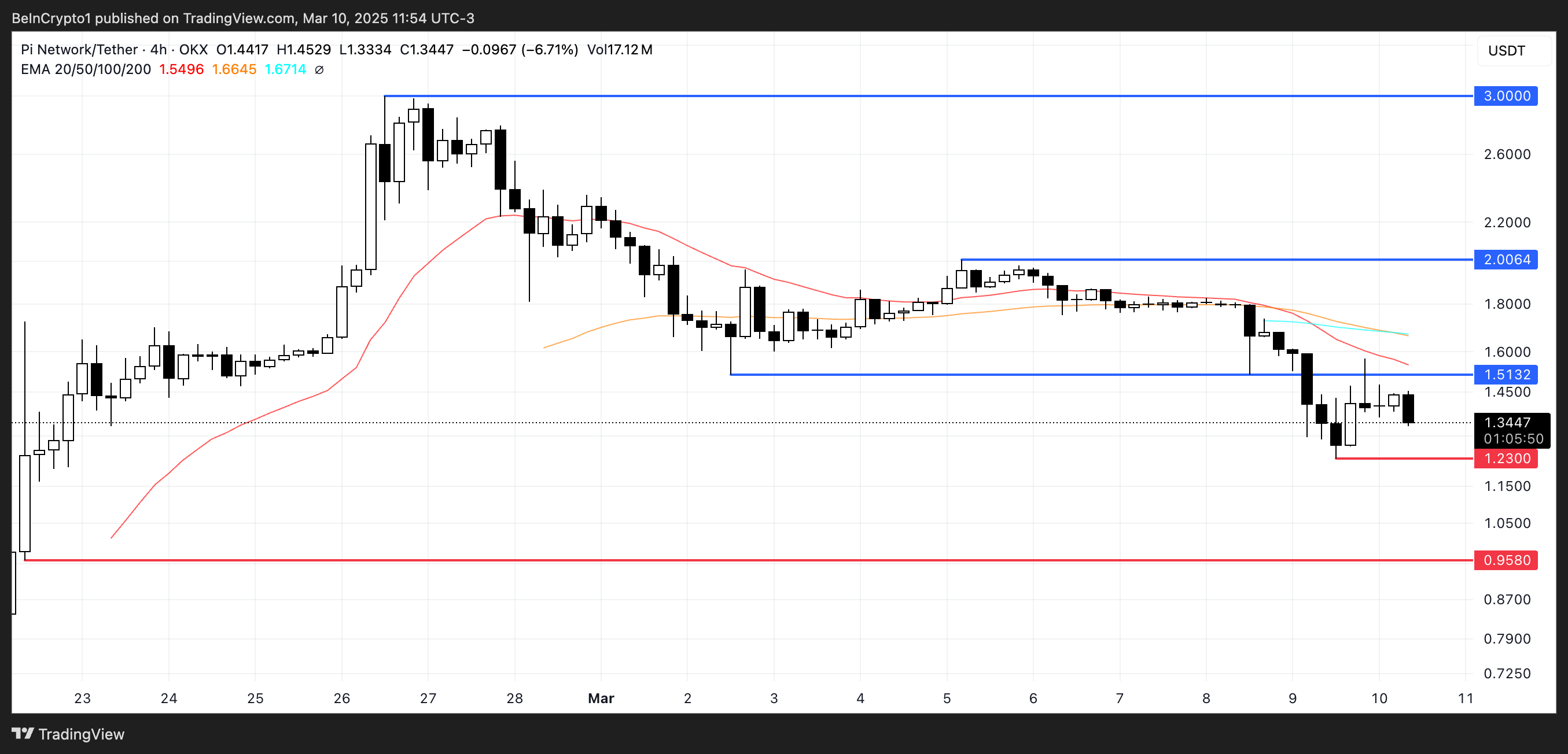 Ang presyo ng Pi Network ay kasalukuyang nagte-trade sa pagitan ng key resistance sa $1.51 at support level sa $1.23, na may EMA lines nito na nagsa-signal ng bearish trend. Maaaring mabuo ang potential death cross sa lalong madaling panahon, na pwedeng magpabilis ng selling pressure.