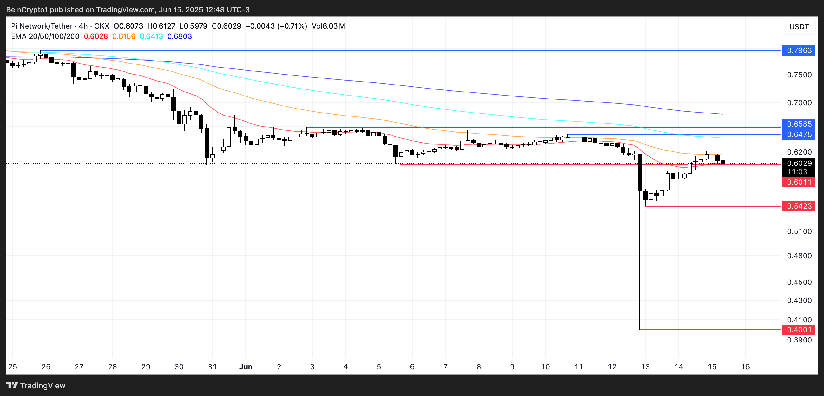 Ang price action ay nasa ibabaw lang ng key support sa $0.601. Kung mababasag ang level na ito, maaaring bumagsak ang presyo ng PI sa $0.542, at kung lalakas pa ang bearish momentum, baka bumagsak pa ito patungo sa $0.40.