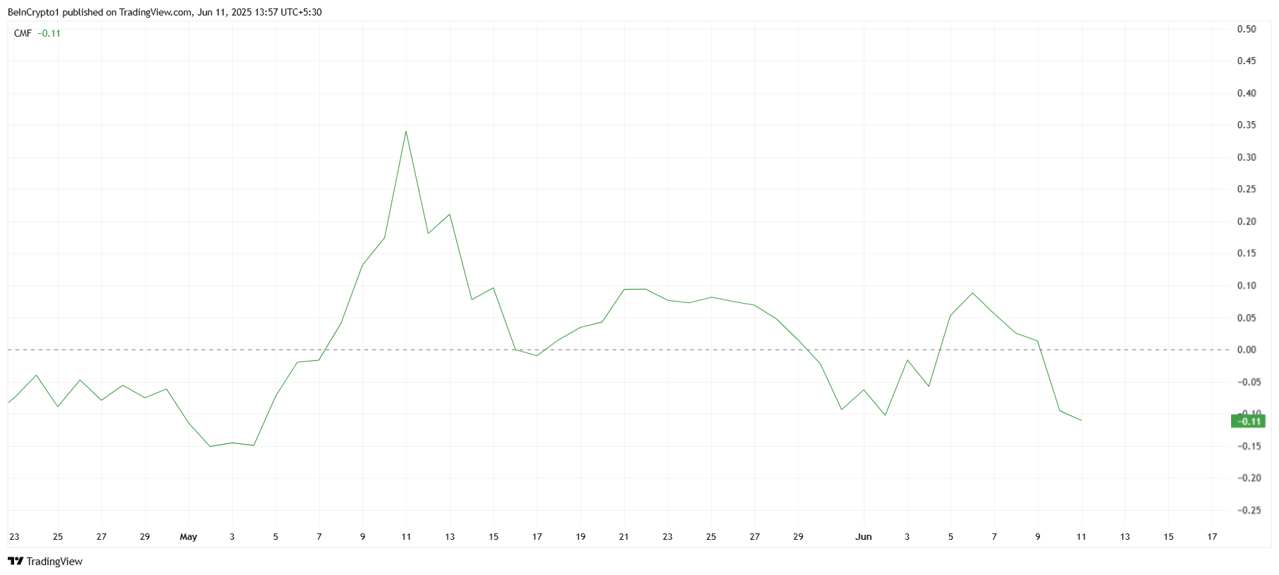 Ang macro momentum ng Pi Network ay nagpapakita rin ng posibleng recovery. Kamakailan lang bumaba ang Chaikin Money Flow (CMF) sa zero line, na nagpapahiwatig ng outflows mula sa altcoin. Naabot ng CMF ang pinakamababang punto nito mula noong early May, na nagpapakita ng pagdududa ng mga investor. Pero kung makokontrol ang outflows at tataas ang inflows, posibleng magbago ang direksyon ng presyo ng Pi Network.