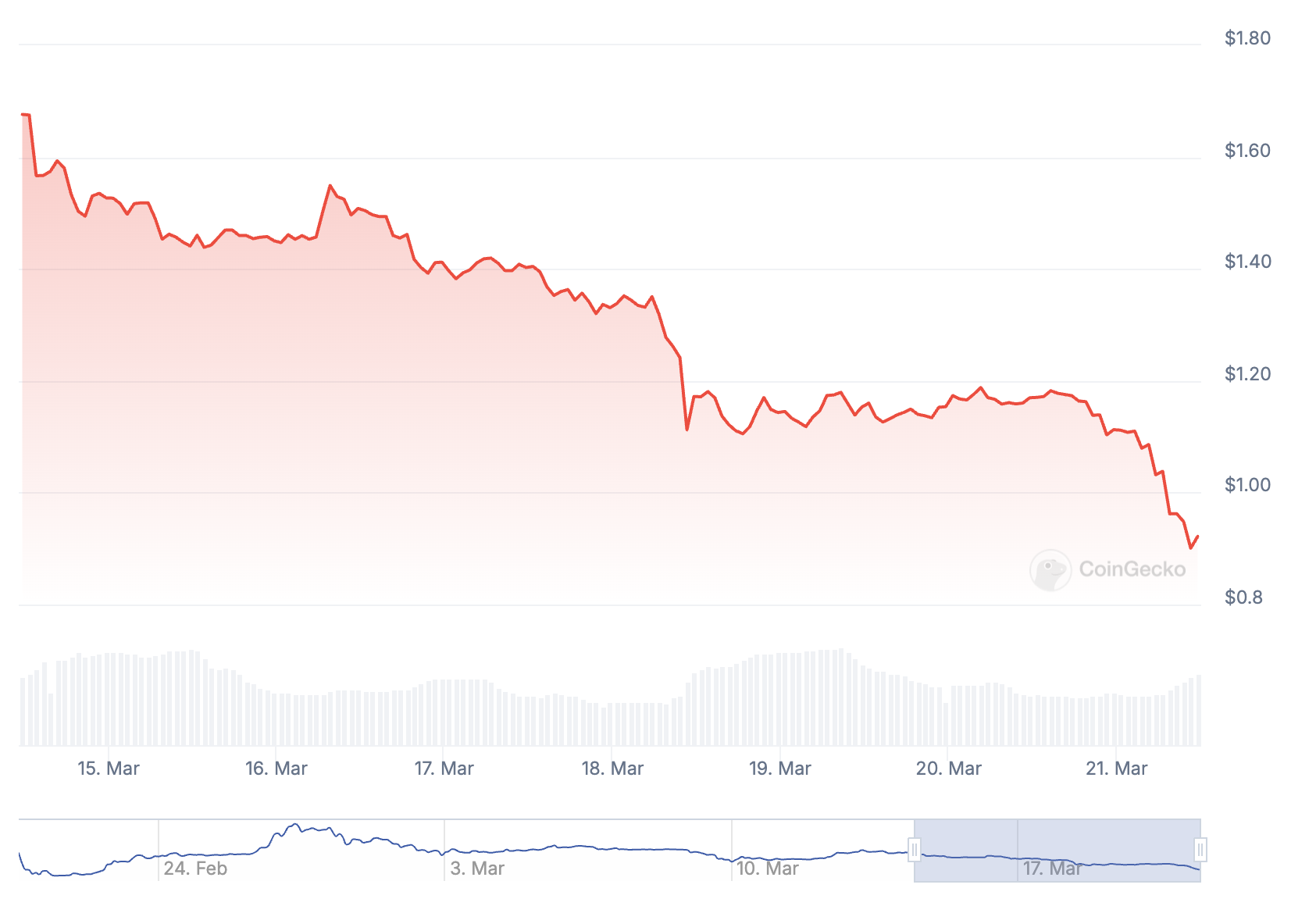 Ang magkasunod na dagok ng kritisismo ni Bons at ang pag-snob ng Binance ay nagkataon sa isang matinding pagbagsak ng merkado para sa PI. Ang presyo ng token ay bumagsak sa ibaba ng $1.0 ngayon sa unang pagkakataon mula noong huling bahagi ng Pebrero.