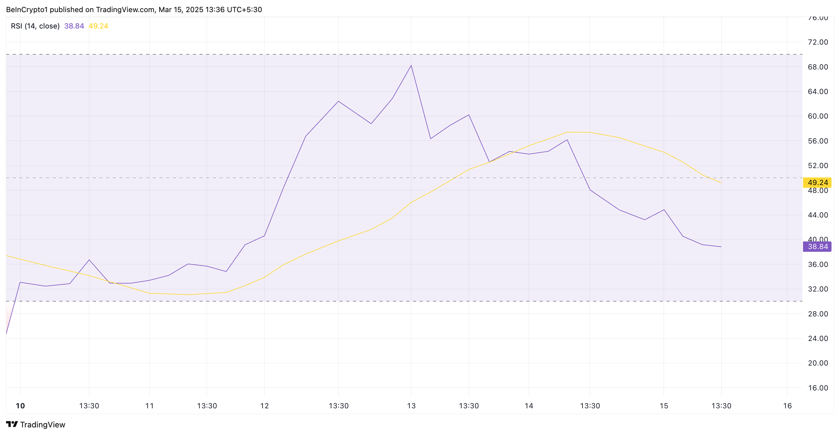 Sa four-hour chart, ang bumabagsak na Relative Strength Index (RSI) ng PI ay nagpapakita ng selling activity sa mga market participant. Nasa 38.84 ito sa oras ng pagsulat.